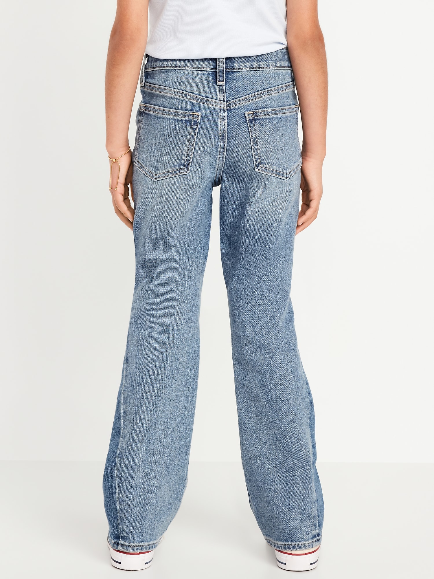High-Waisted Flare-Leg Jeans for Girls: The it fits she really, really wants.interior adjustable waistband, sizes 5-8 snap-button closure, sizes 10-20 regular button closure, zip fly, utility pockets at front, patch pockets at back, flared leg, #855058