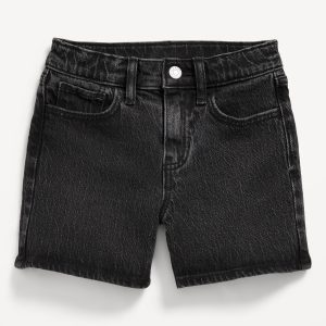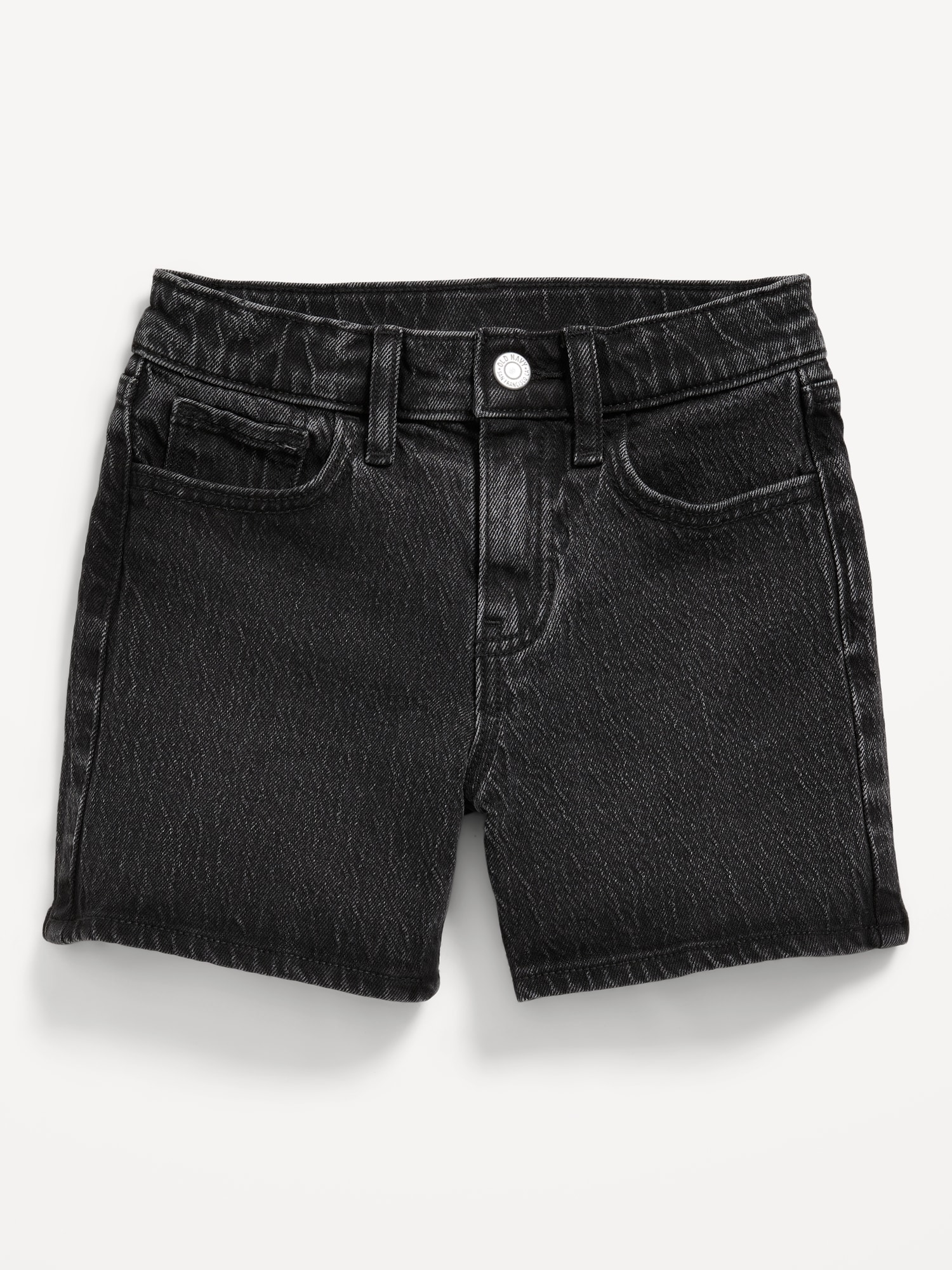 High-Waisted Jean Midi Shorts for Girls: interior adjustable waistband, sizes 5-8 snap-button closure, sizes 10-20 regular button closure, exposed button fly, patch pockets at front, patch pockets in back, #767091