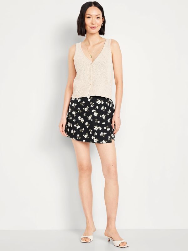 High-Waisted Linen-Blend Mini Skort: faux-wrap front, elastic back waist, built-in shorts, #766917
