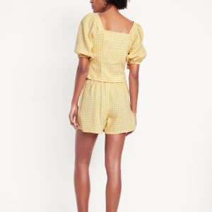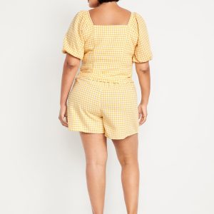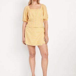 High-Waisted Linen-Blend Mini Wrap Skort: faux-wrap front, elastic back waist, built-in shorts, #766917