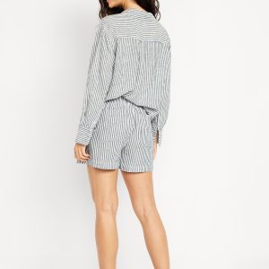High-Waisted Linen-Blend Shorts — 3.5-inch inseam: comfort elastic waistband, on-seam hip pockets, back patch pockets, easy pull-on style, #693453