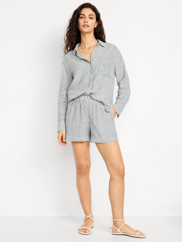High-Waisted Linen-Blend Shorts — 3.5-inch inseam: comfort elastic waistband, on-seam hip pockets, back patch pockets, easy pull-on style, #693453