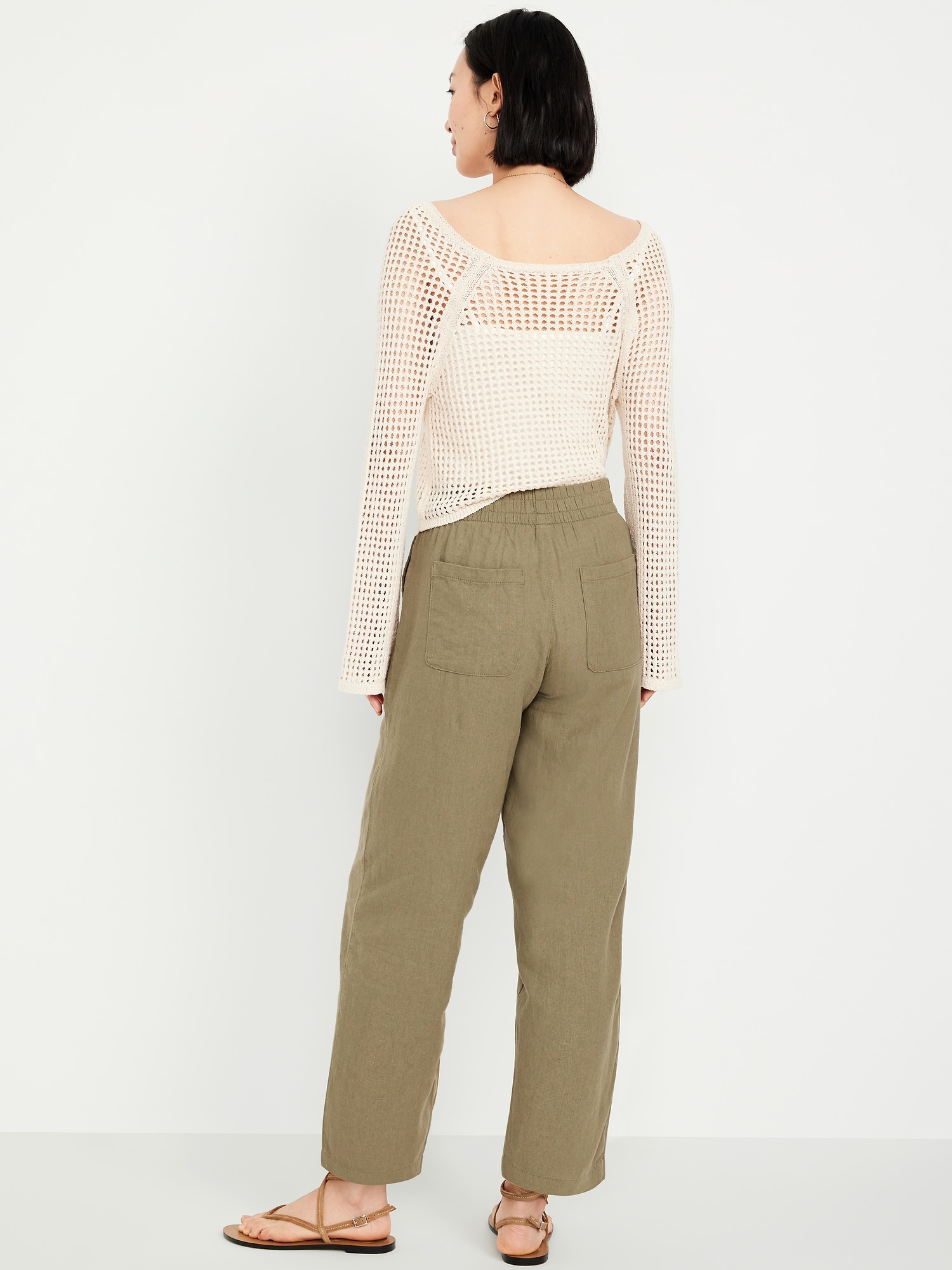 High-Waisted Linen-Blend Straight Ankle Pants: elasticized waistband, on-seam hip pockets, back patch pockets, straight leg, pull-on style, #683297