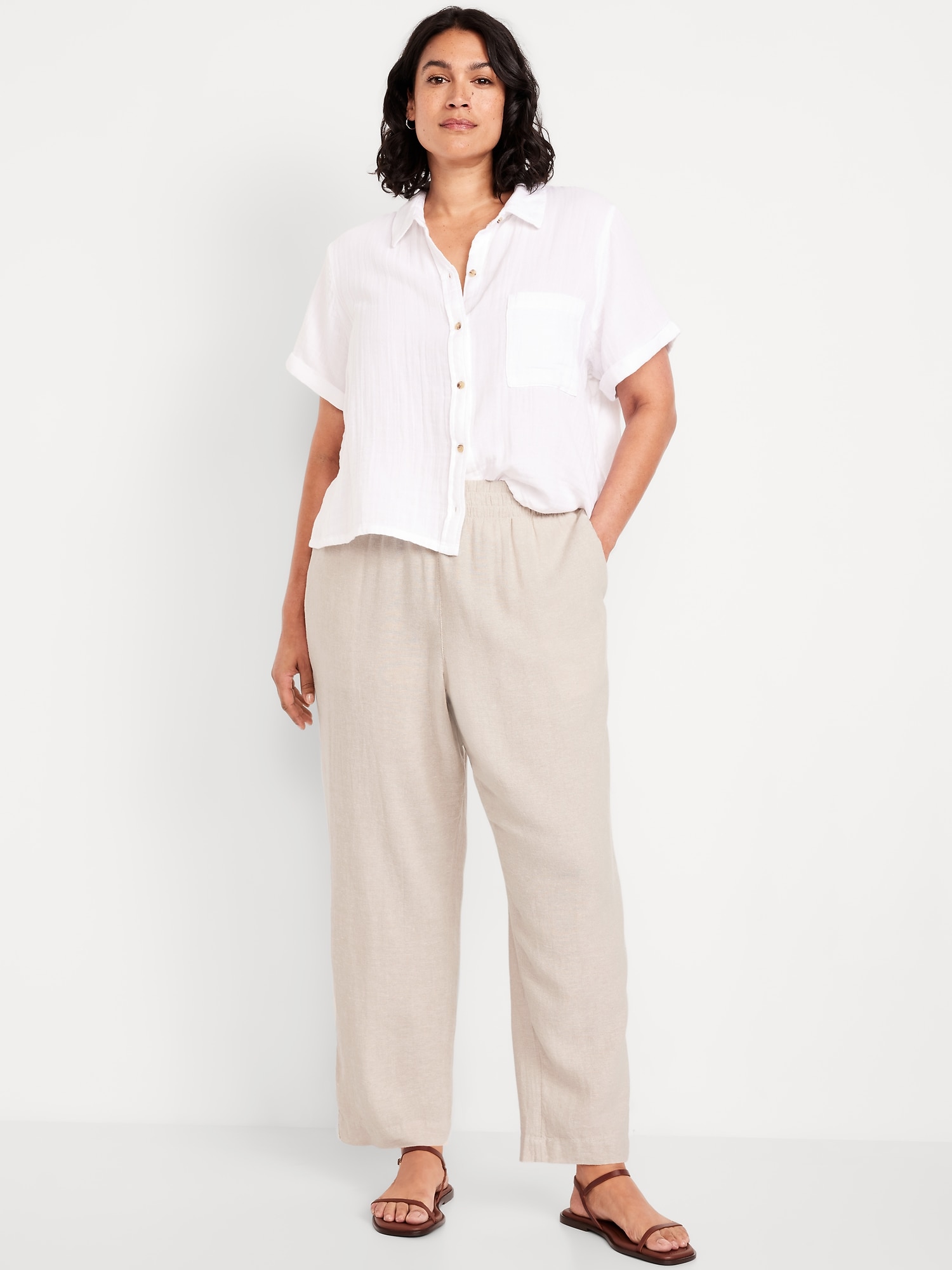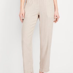 High-Waisted Linen-Blend Straight Ankle Pants: elasticized waistband, on-seam hip pockets, back patch pockets, straight leg, pull-on style, #683297