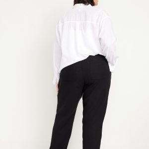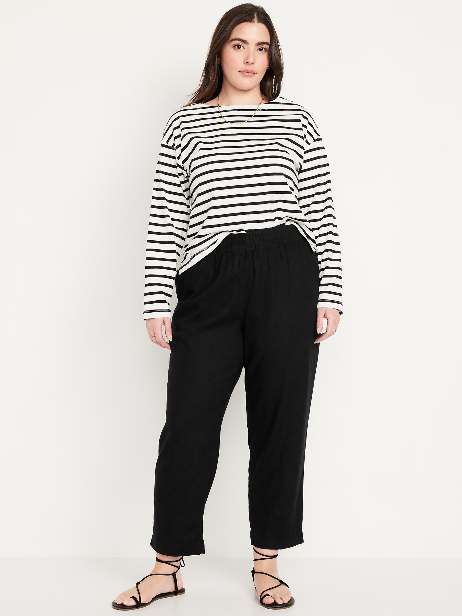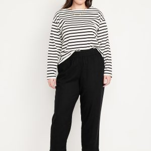 High-Waisted Linen-Blend Straight Ankle Pants: elasticized waistband, on-seam hip pockets, back patch pockets, straight leg, pull-on style, #683297