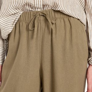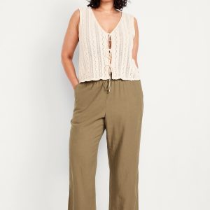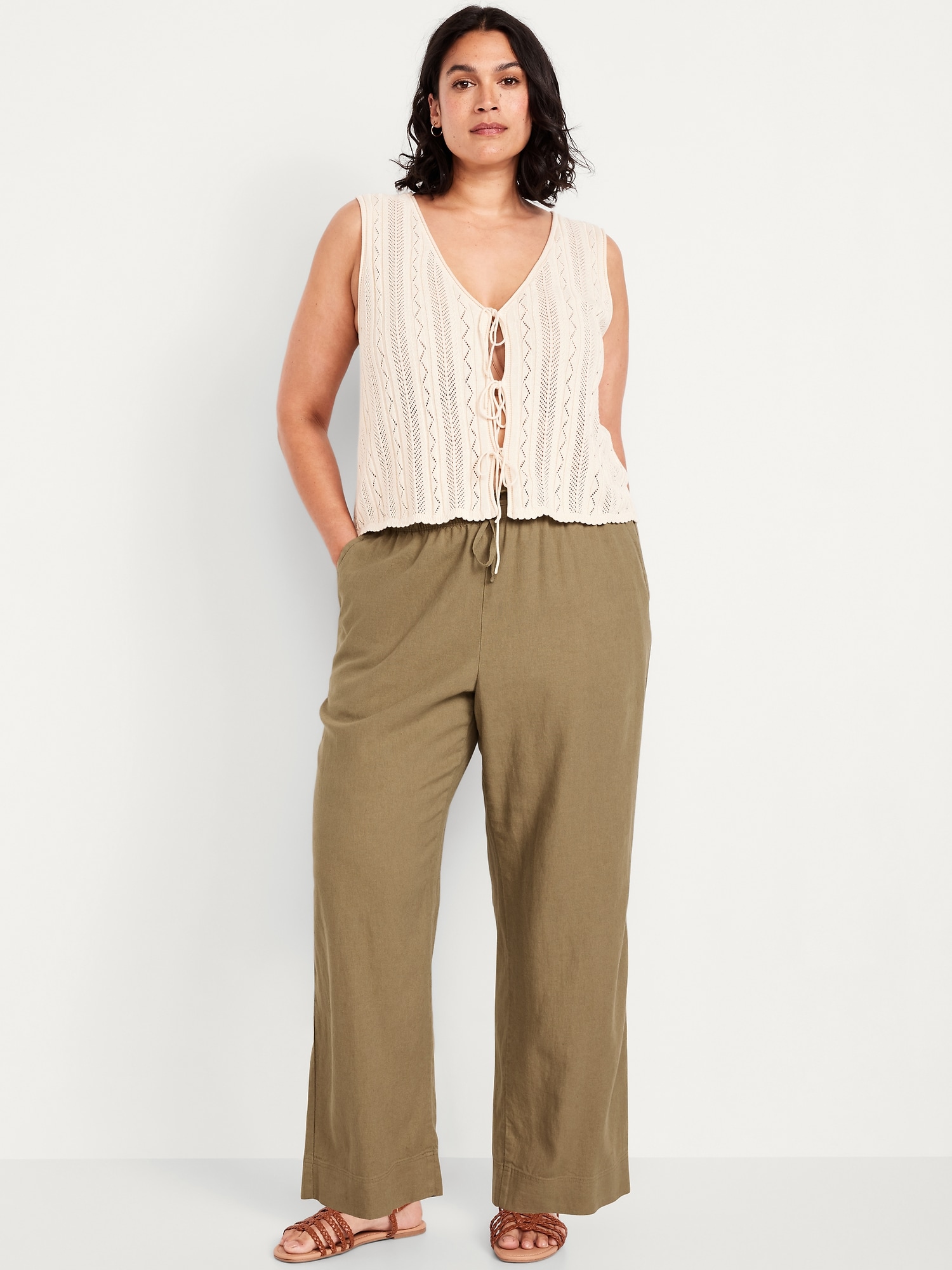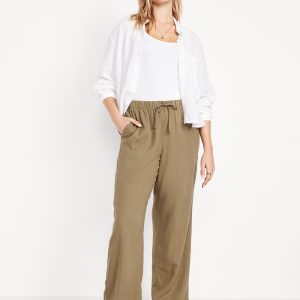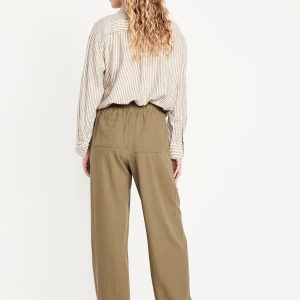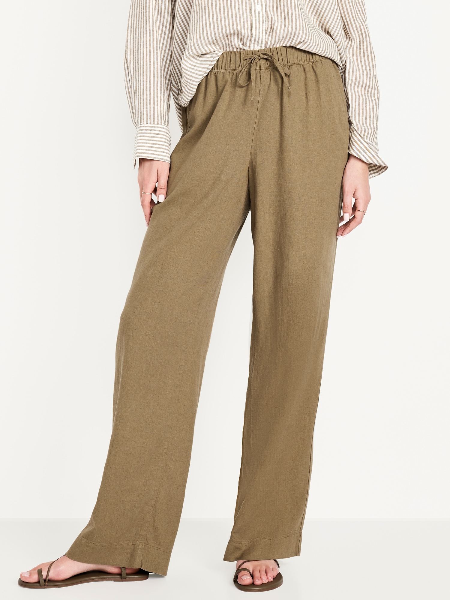 High-Waisted Linen-Blend Straight Pants: comfort elastic-drawstring waistband, side-seam pockets, back patch pockets, straight leg, easy pull-on style, #784300