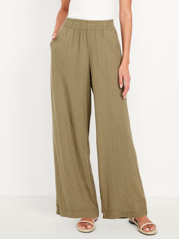 High-Waisted Linen-Blend Wide-Leg Pants: comfort elastic-drawstring waist, side-seam pockets, wide leg, vertical striped print, pull-on style, #766295