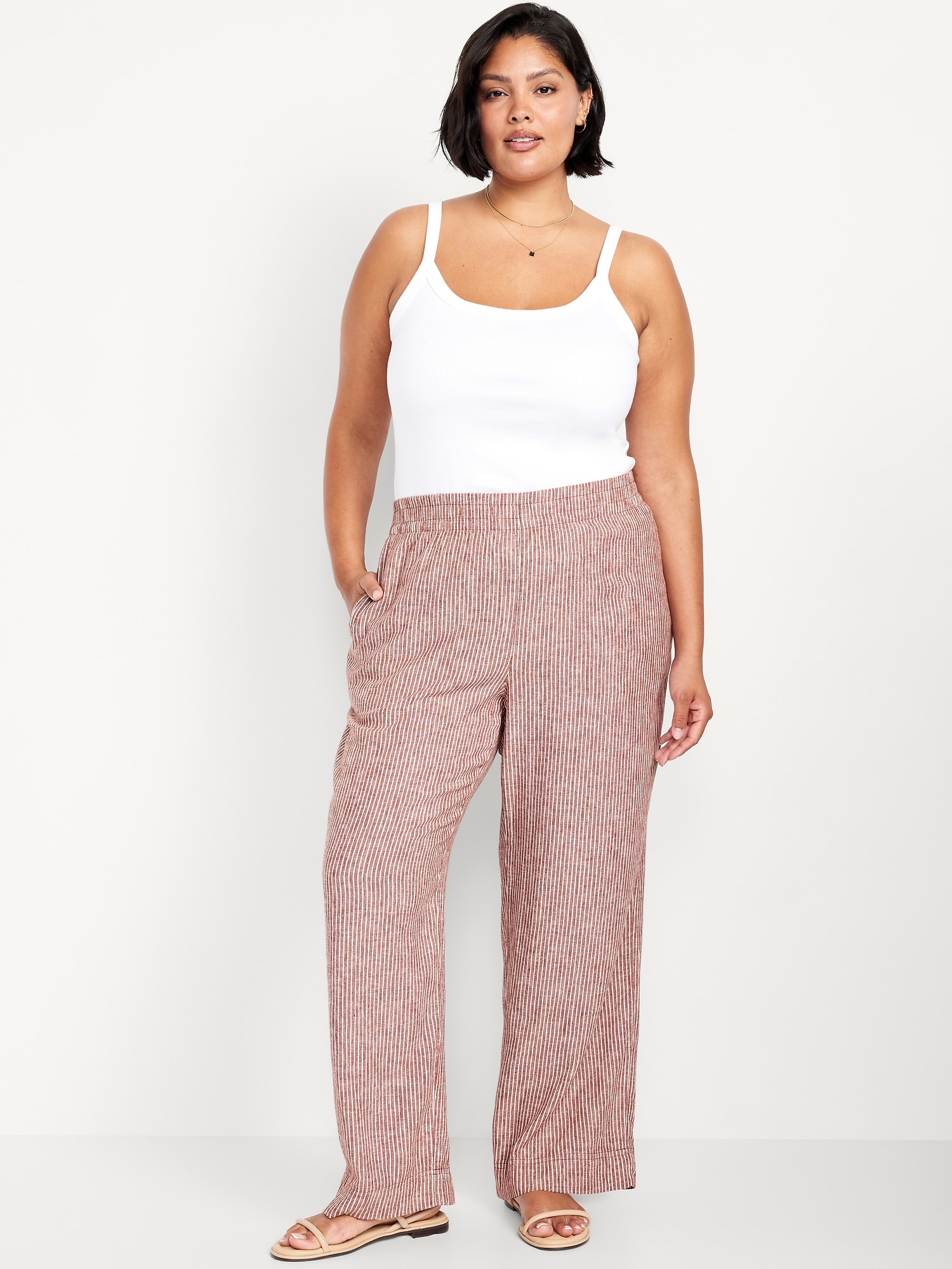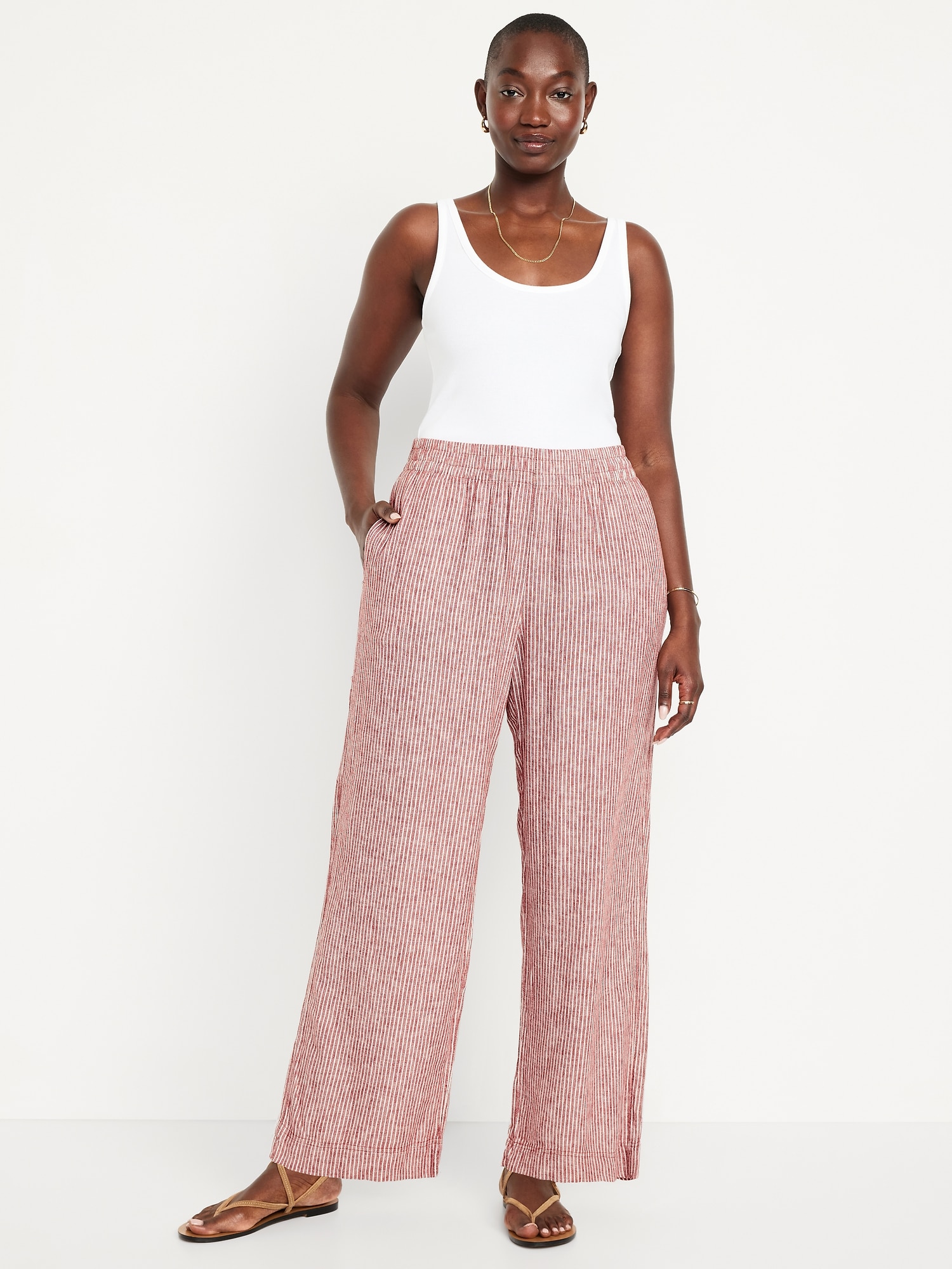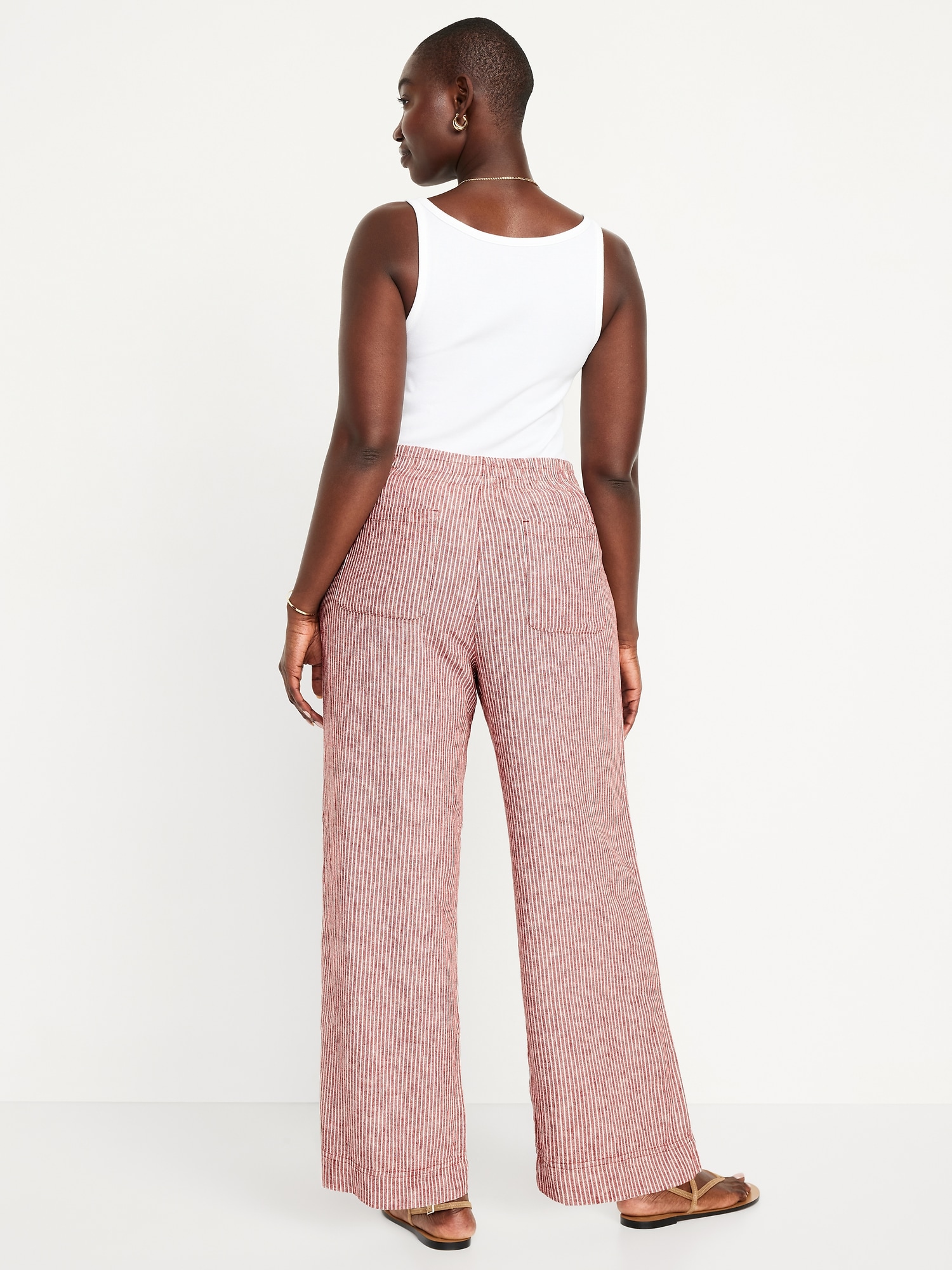 High-Waisted Linen-Blend Wide-Leg Pants: comfort elastic-drawstring waist, side-seam pockets, wide leg, vertical striped print, pull-on style, #766295
