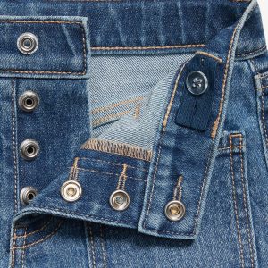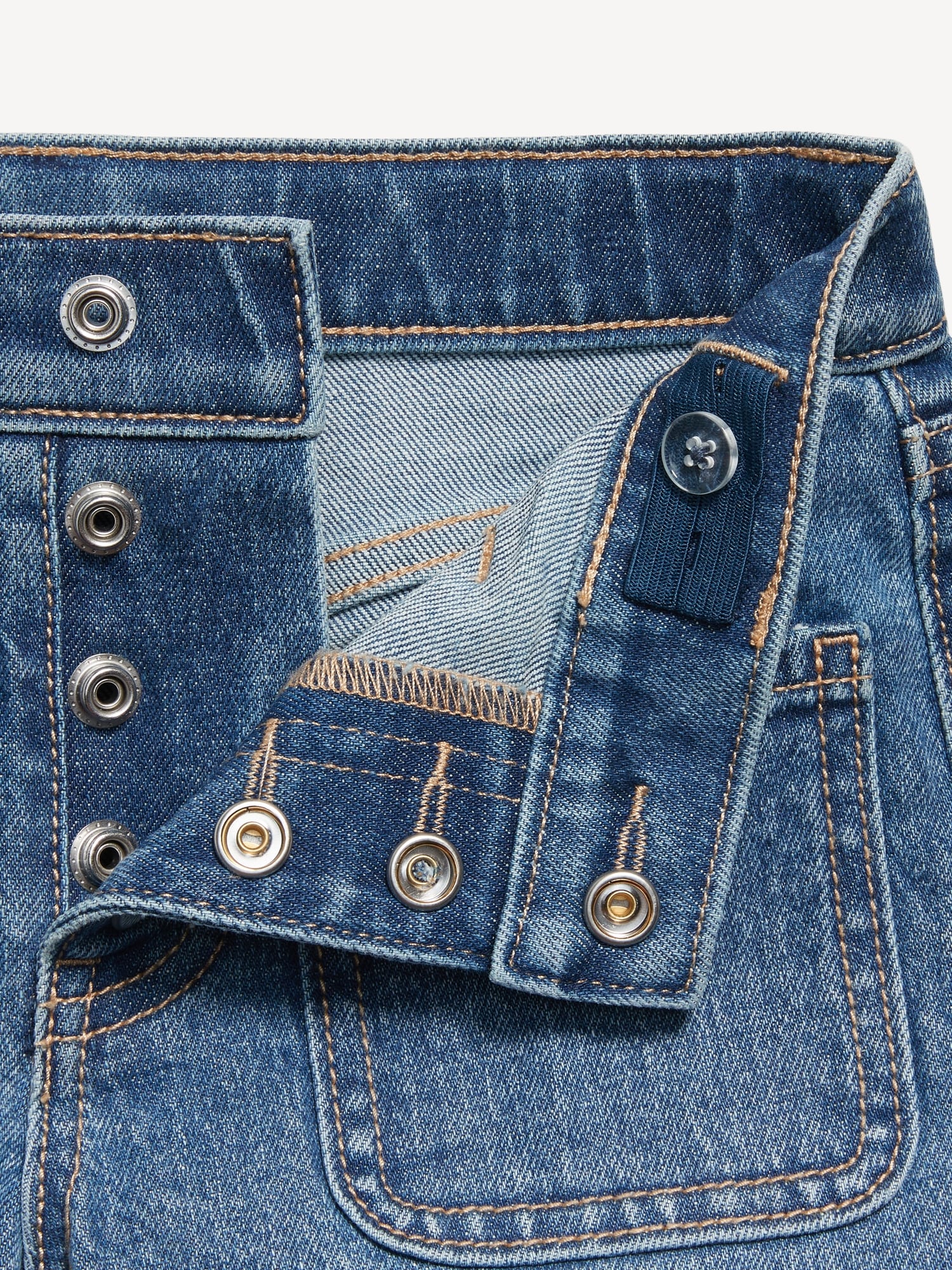 High-Waisted Mariner Midi Jean Shorts for Girls: interior adjustable waistband, sizes 5-8 snap-button closure, sizes 10-20 regular button closure, exposed button fly, patch pockets at front, patch pockets in back, #767091