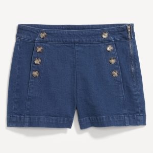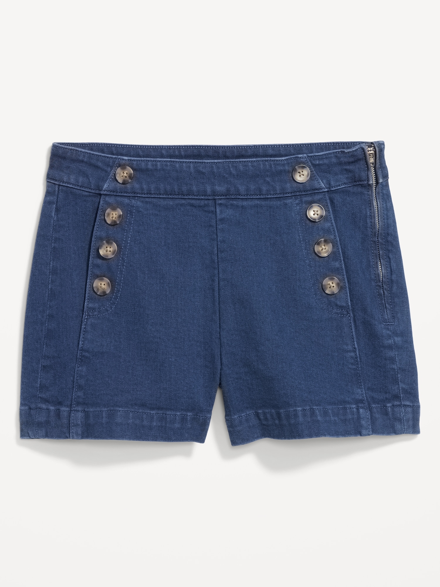 High-Waisted Mariner Shorts — 3-inch inseam: button accents at each hip, left side zipper, back patch pockets, darted back, online exclusive, #695098