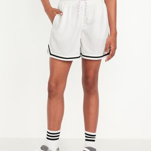 High-Waisted Mesh Basketball Shorts for Girls: high rise, elasticized waistband, adjustable drawstring, on-seam side pockets, retro striped tape trim at leg openings, vented sides, #696474