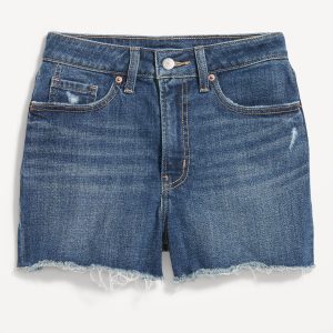 High-Waisted OG Jean Shorts — 3-inch inseam: button front, belt loops, zip front, front scoop pockets, back patch pockets, cutoff hem, #846719