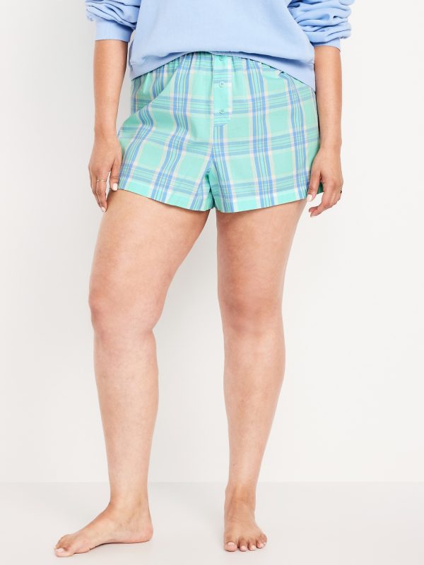 High-Waisted Poplin Boxer Pajama Shorts: elastic waistband, decorative button fly, plaid print, #798497