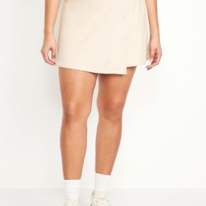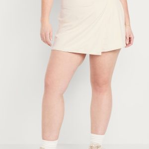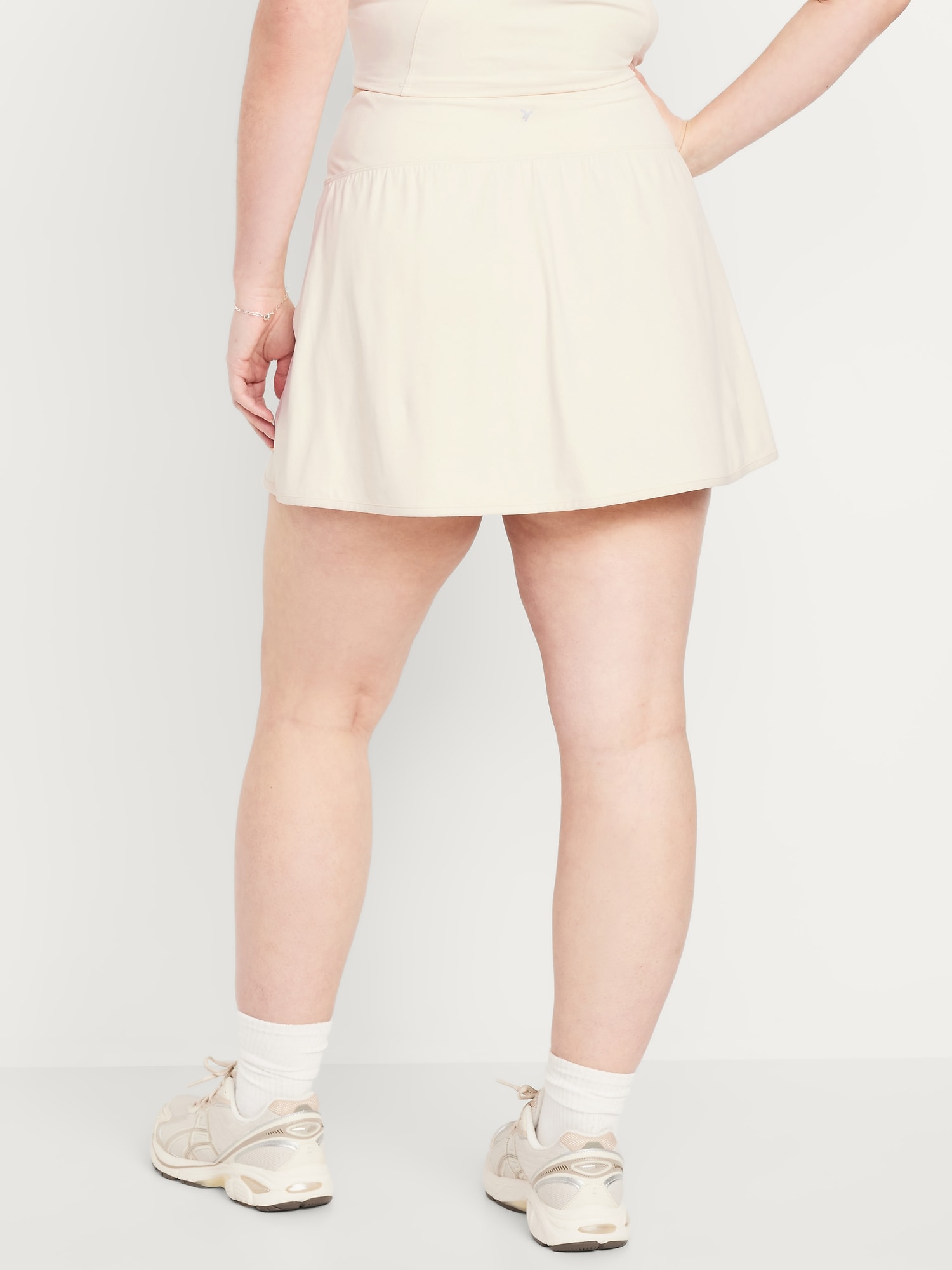 High-Waisted PowerSoft Faux-Wrap Skort: Featuring PowerSoft. Light compression meets a peachy-smooth, sweat-wicking fabric.pull-on waistband, faux-wrap front, built-in bike shorts, mini length, go-dry wicks moisture, breathable, #694169