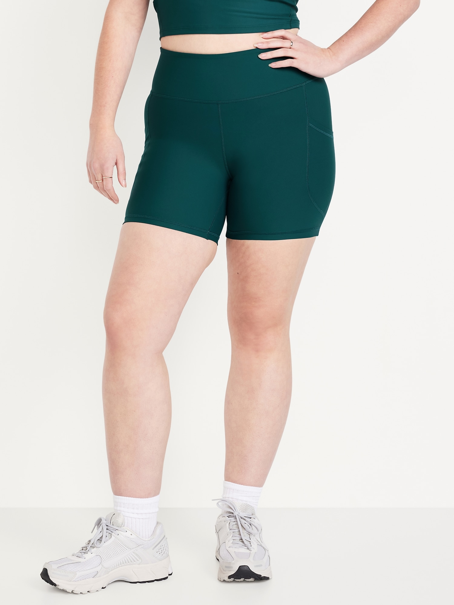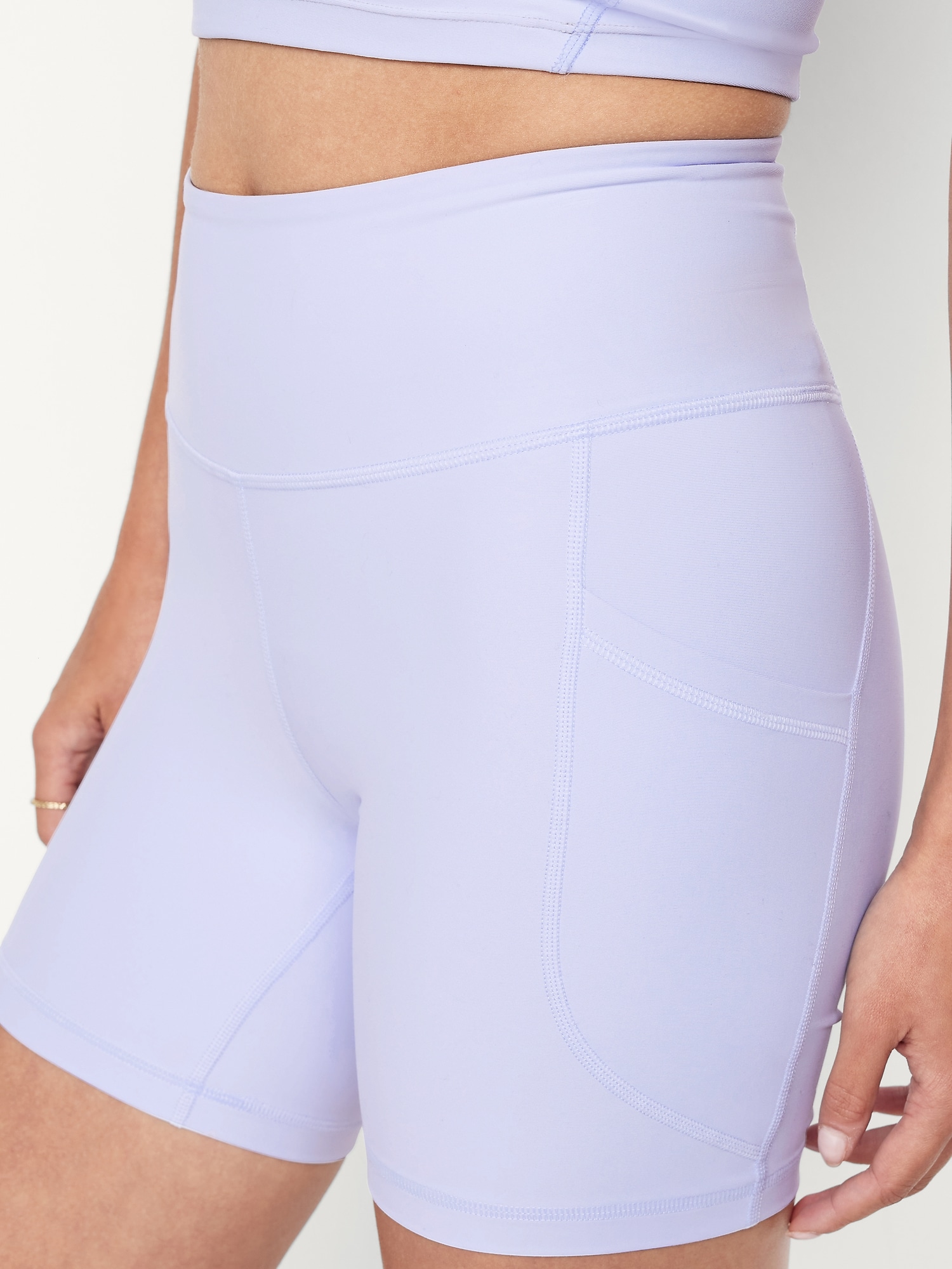 High-Waisted PowerSoft Pocket Biker Shorts — 6-inch inseam: Featuring PowerSoft. Light compression meets a peachy-smooth, sweat-wicking fabric.pull-on waist, side pocket fits your phone, go-dry wicks moisture, #662948