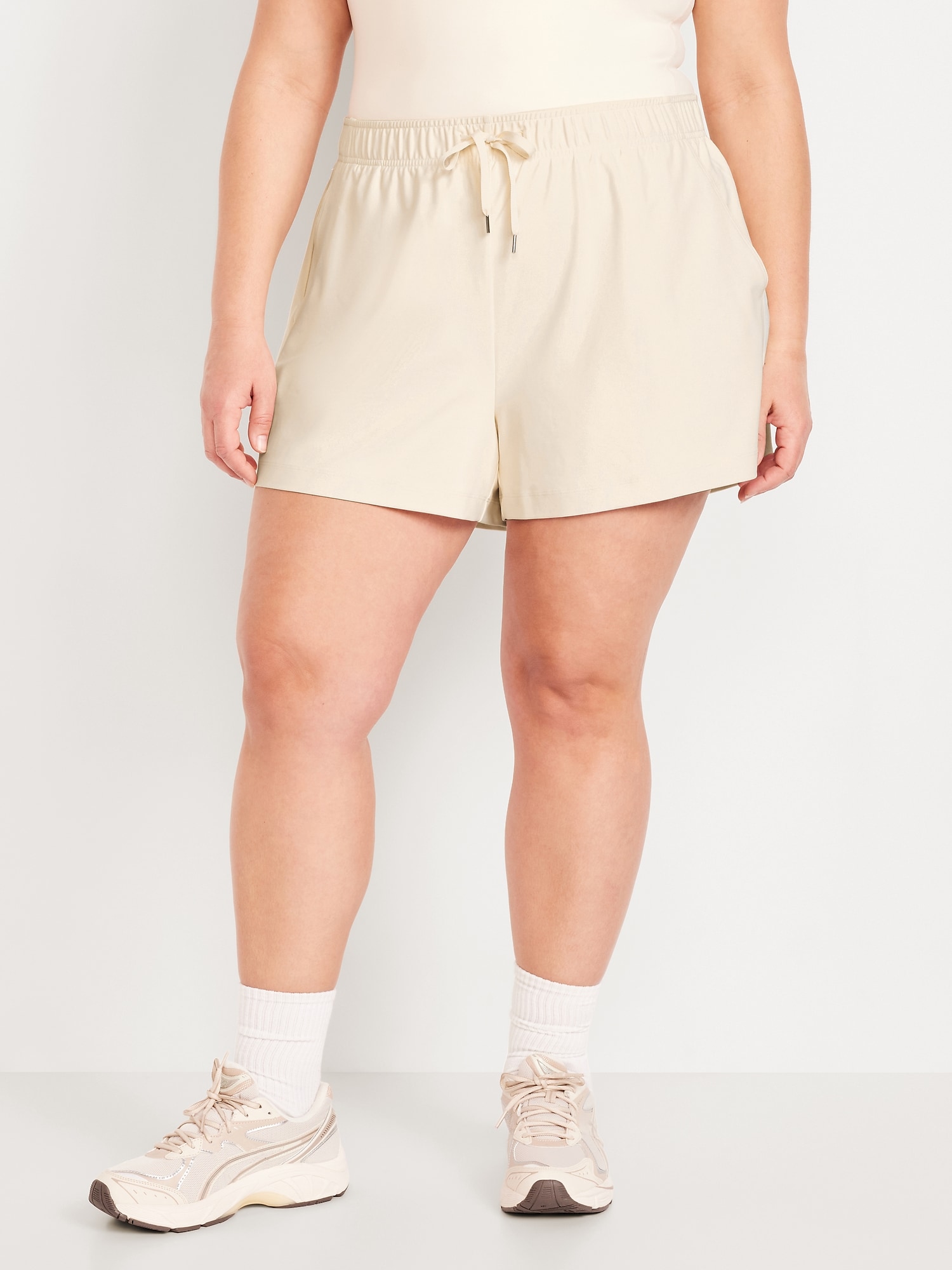 High-Waisted PowerSoft Shorts — 3.5-inch inseam: Featuring PowerSoft. Light compression meets a peachy-smooth, sweat-wicking fabric.elastic-drawstring waistband, diagonal hip pockets, go-dry wicks moisture, breathable, easy pull-on style, #694167