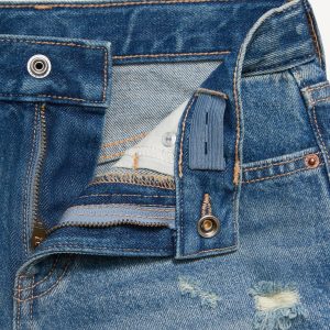 High-Waisted Ripped Frayed-Hem Jean Shorts for Girls: interior adjustable waistband, sizes 5-8 snap-button closure, sizes 10-20 regular button closure, zip fly, scoop pockets and coin pocket at front, patch pockets at back, frayed hem, heart pattern at sides, #767082