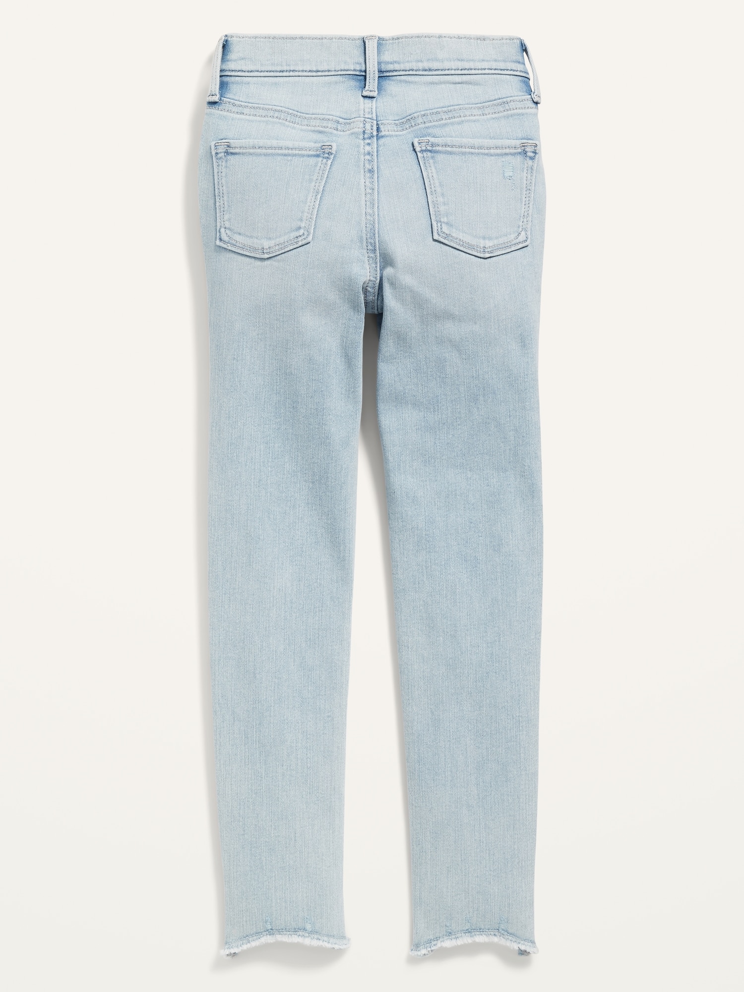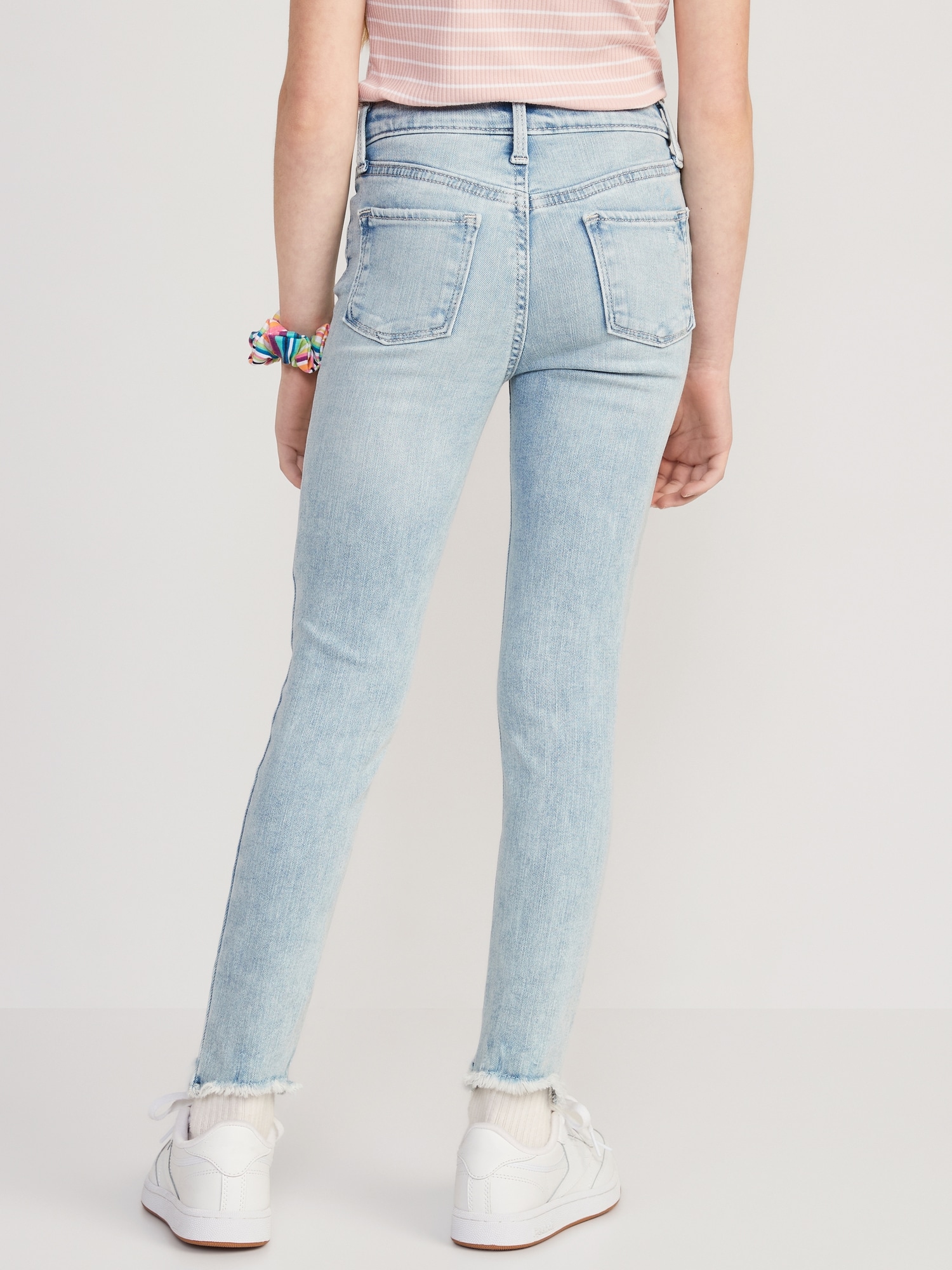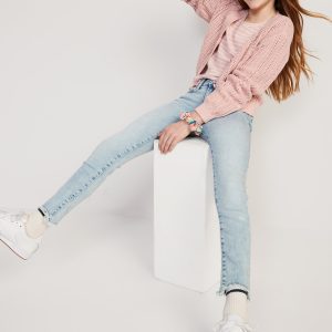 High-Waisted Rockstar 360° Stretch Frayed-Hem Super Skinny Jeggings for Girls: The it fits she really, really wants.interior adjustable waistband, snap-button closure in sizes 5-8, regular button closure in sizes 10-20, zip fly, scoop pockets and coin pocket at front, patch pockets at back, #876134