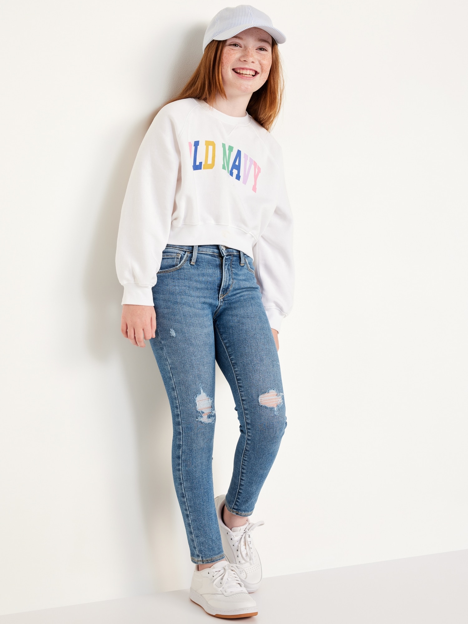 High-Waisted Rockstar 360° Stretch Ripped Jeggings for Girls: The it fits she really, really wants.interior adjustable waistband, snap-button closure in sizes 5-8, regular button closure in sizes 10-20, zip fly, scoop pockets and coin pocket at front, patch pockets at back, #876134