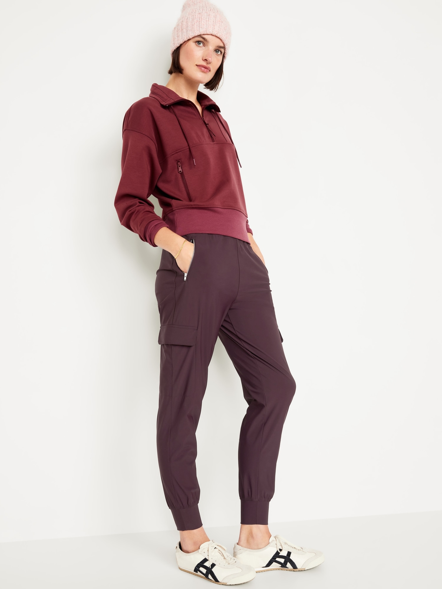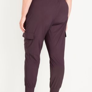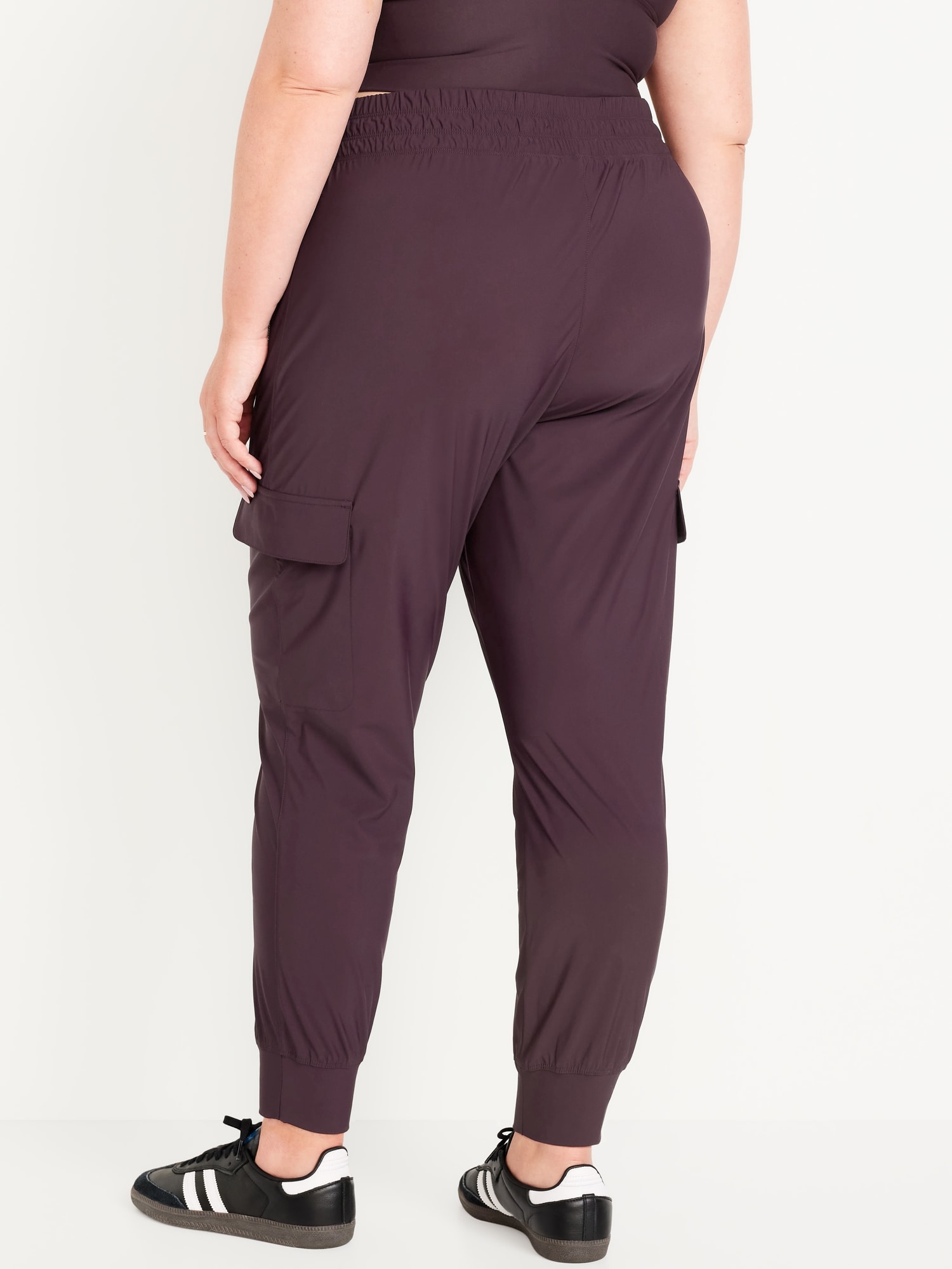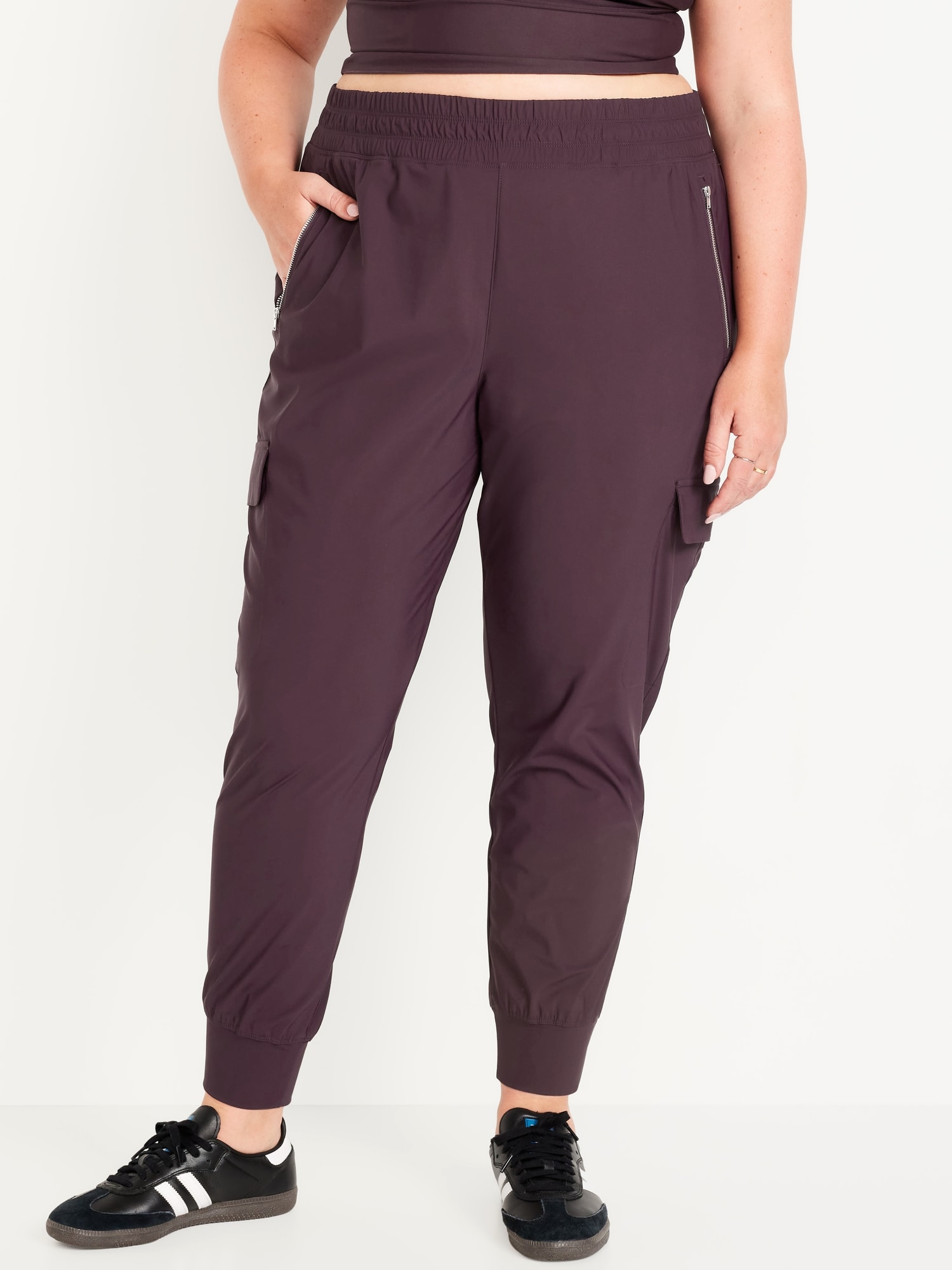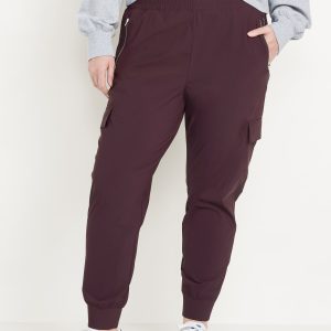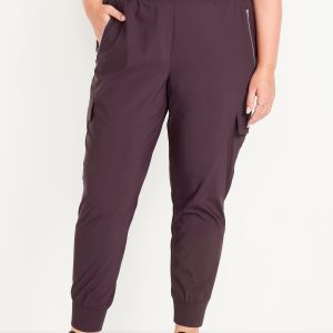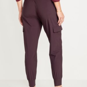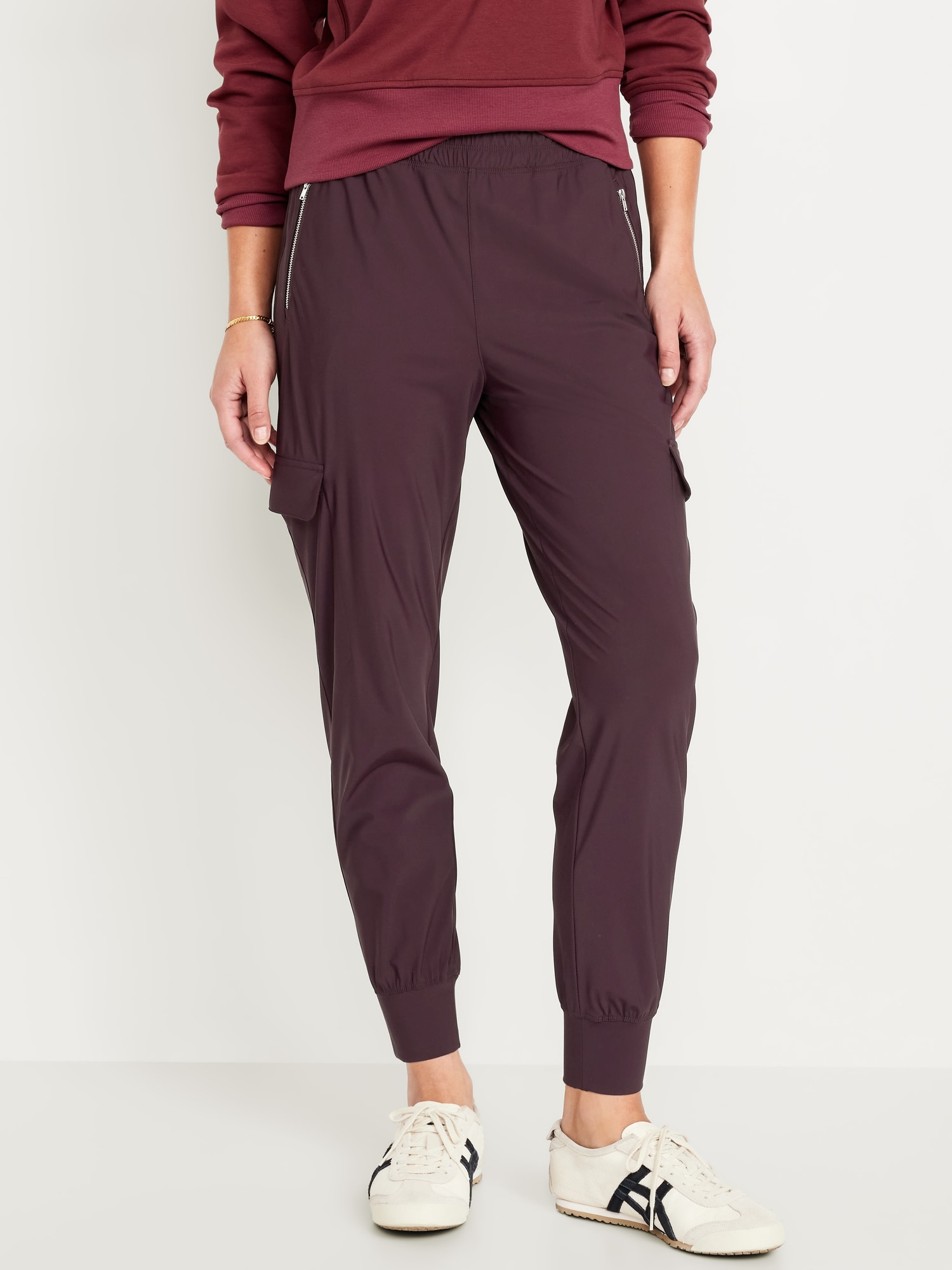 High-Waisted SleekTech Cargo Joggers: Featuring SleekTech. Polished and lightweight, with serious stretch.elastic waist, zippered hip pockets, flap-cargo pockets at thigh, go-dry wicks moisture, breathable, pull-on style, #569700