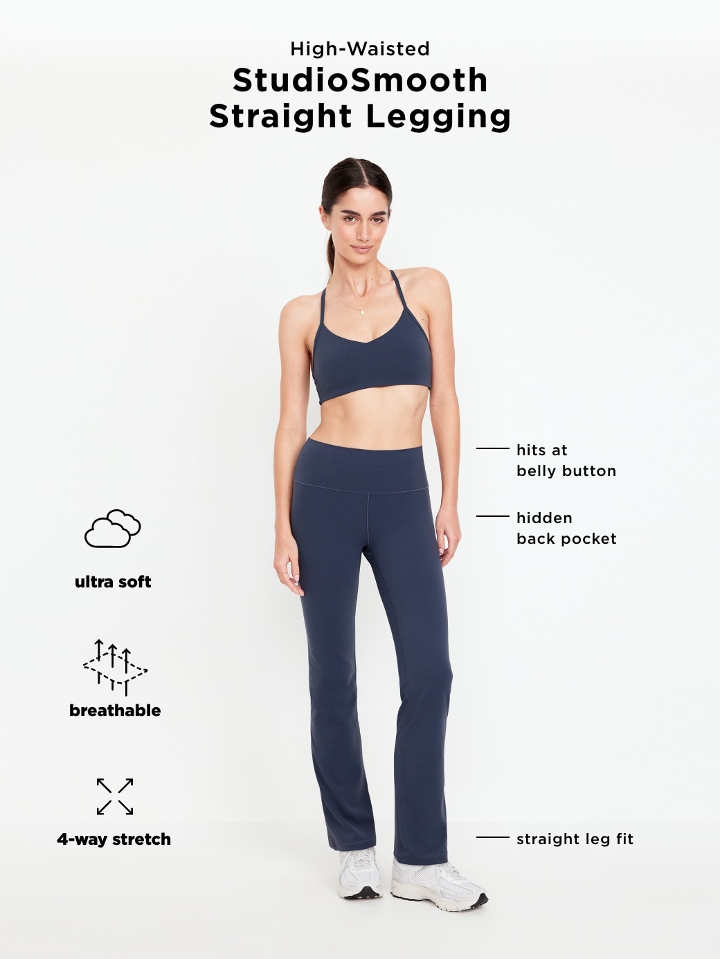 High-Waisted StudioSmooth Straight Legging: Featuring StudioSmooth. Buttery soft and breathable, with a barely-there feel.hidden back pocket, pull-on waistband, go-dry wicks moisture, straight leg, #662744