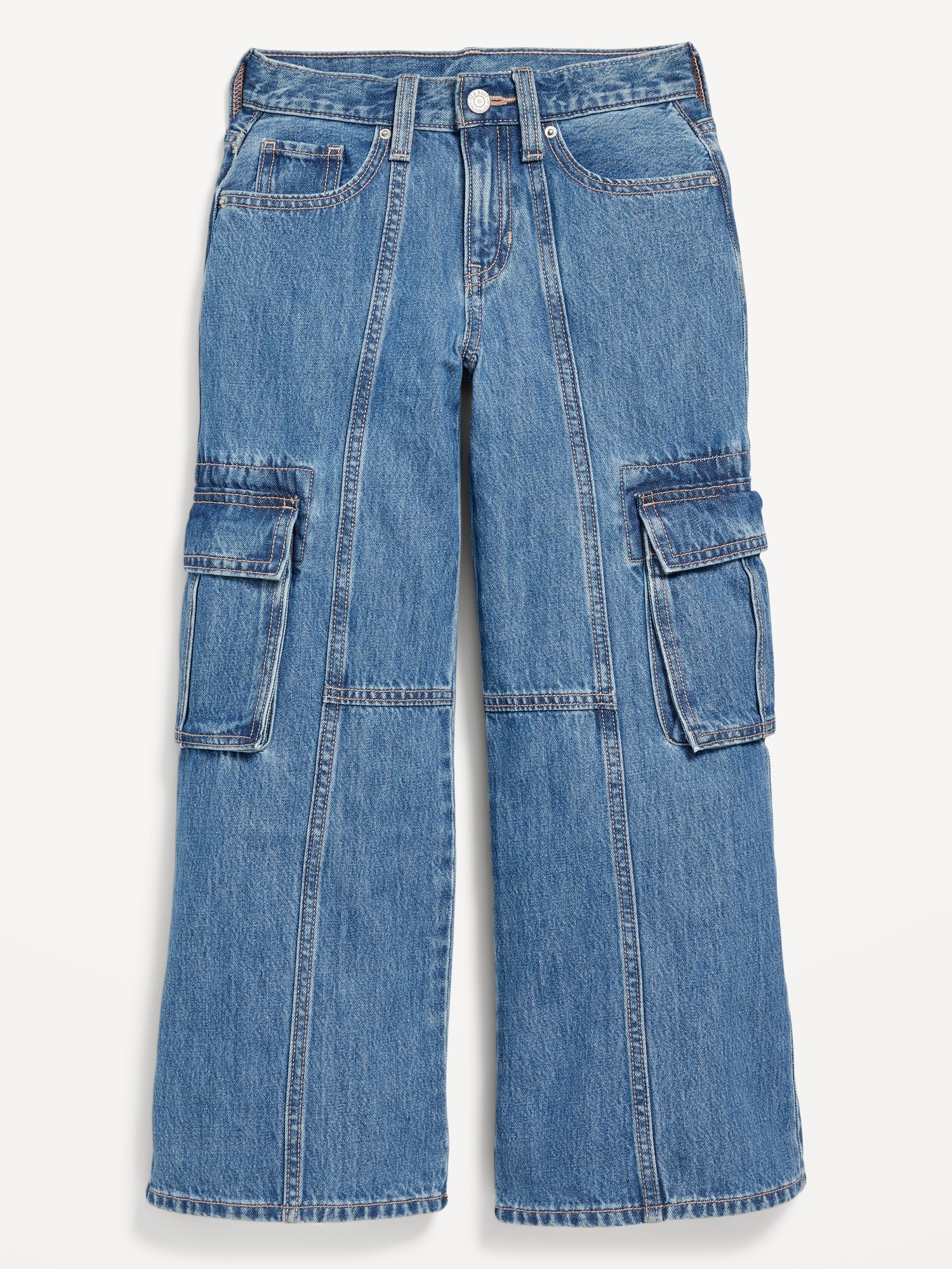 High-Waisted Super Baggy Wide-Leg Cargo Jeans for Girls: interior adjustable waistband, snap button closure (sizes 5-8), regular button closure (sizes 10-20), zip fly, scoop pockets and coin pocket, patch pockets at back, flap-cargo pockets, super wide leg opening, #583291