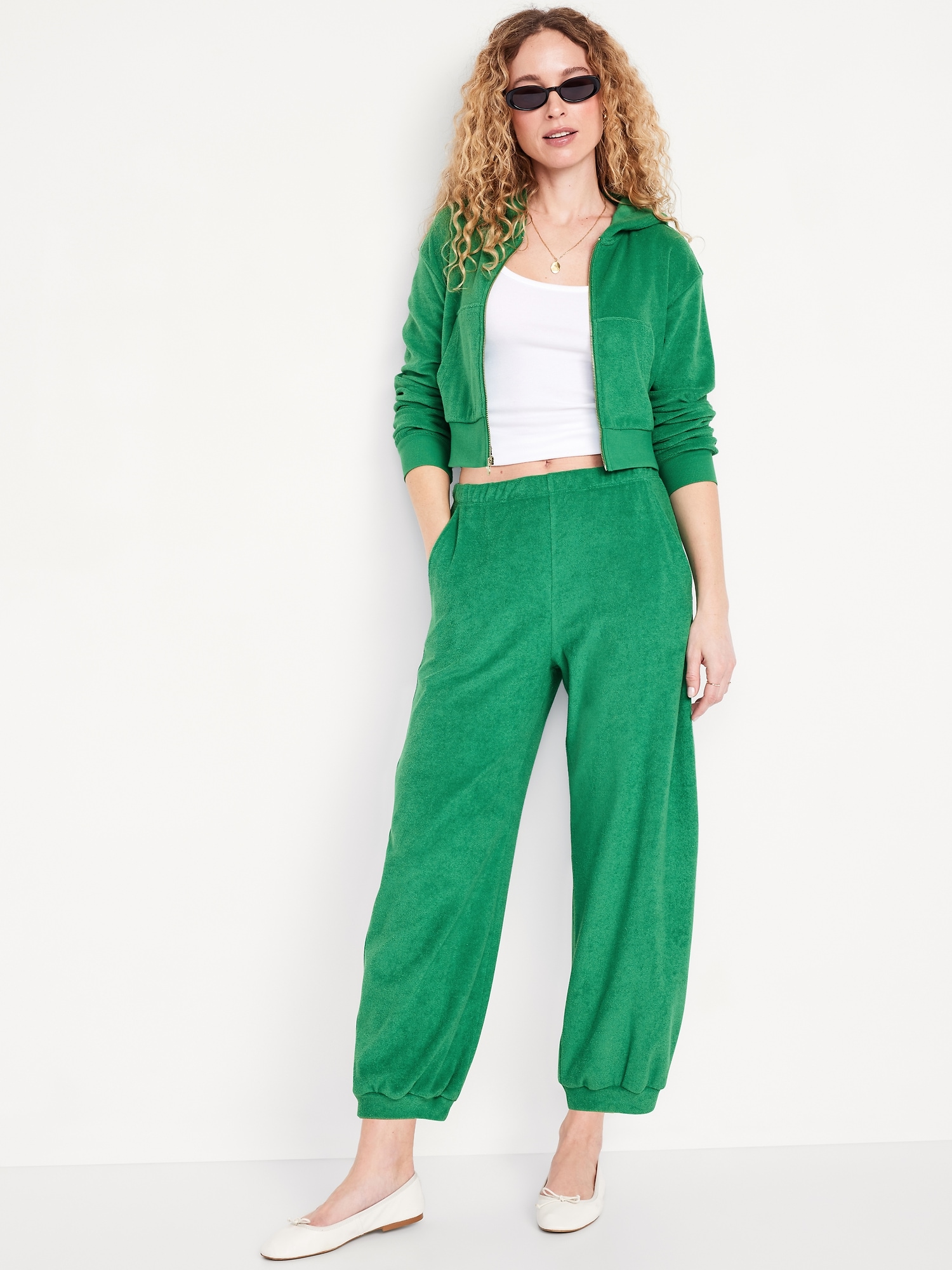 High-Waisted Towel Terry Barrel Ankle Pants: elastic waistband, on-seam pockets, cuffed barrel leg, #749658