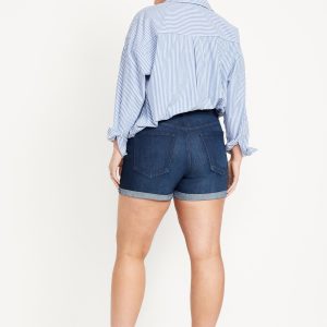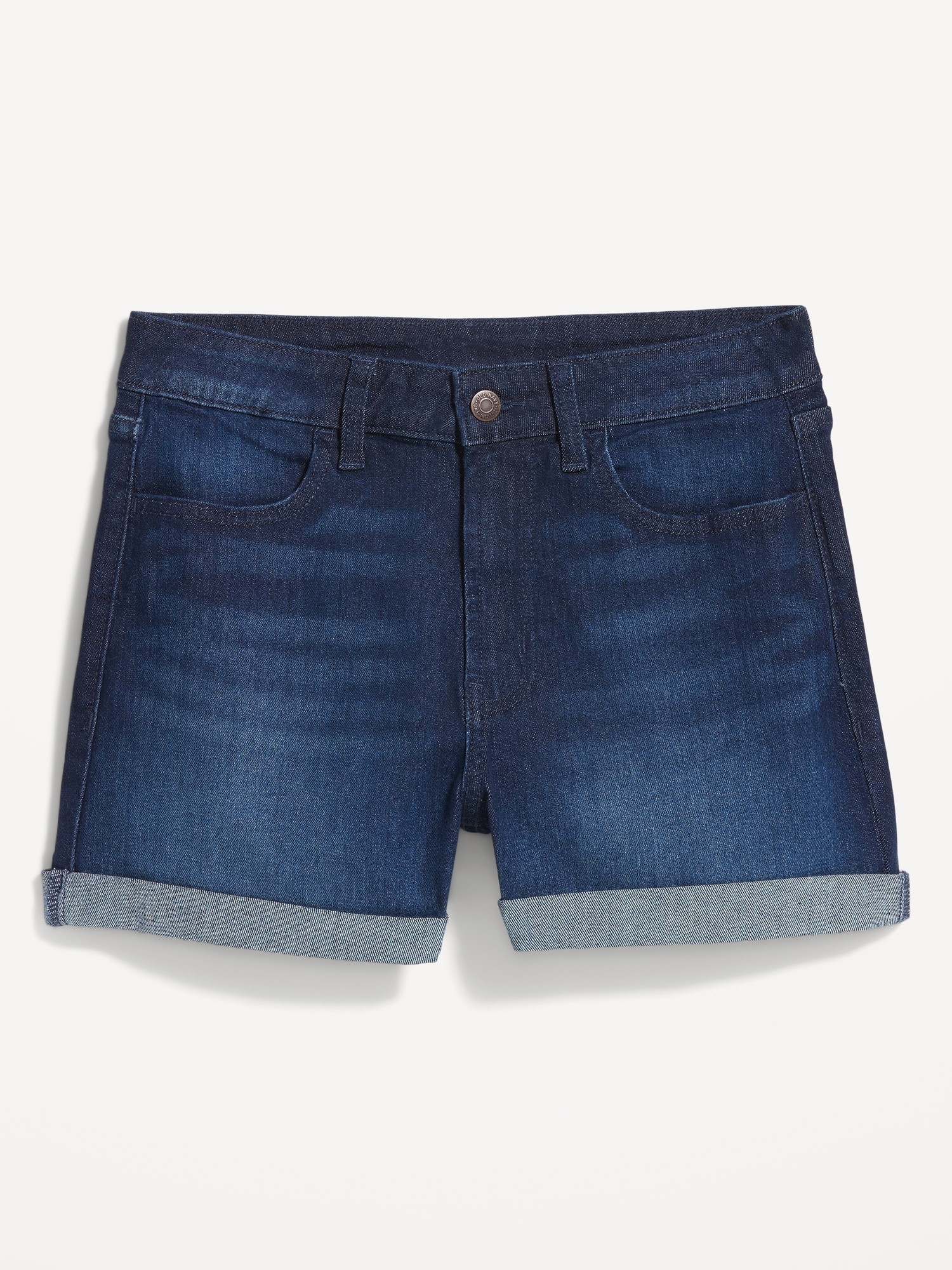 High-Waisted Wow Jean Shorts — 3-inch inseam: button front, belt loops, zip fly, front scoop pockets, back patch pockets, cuffed hem, #890124