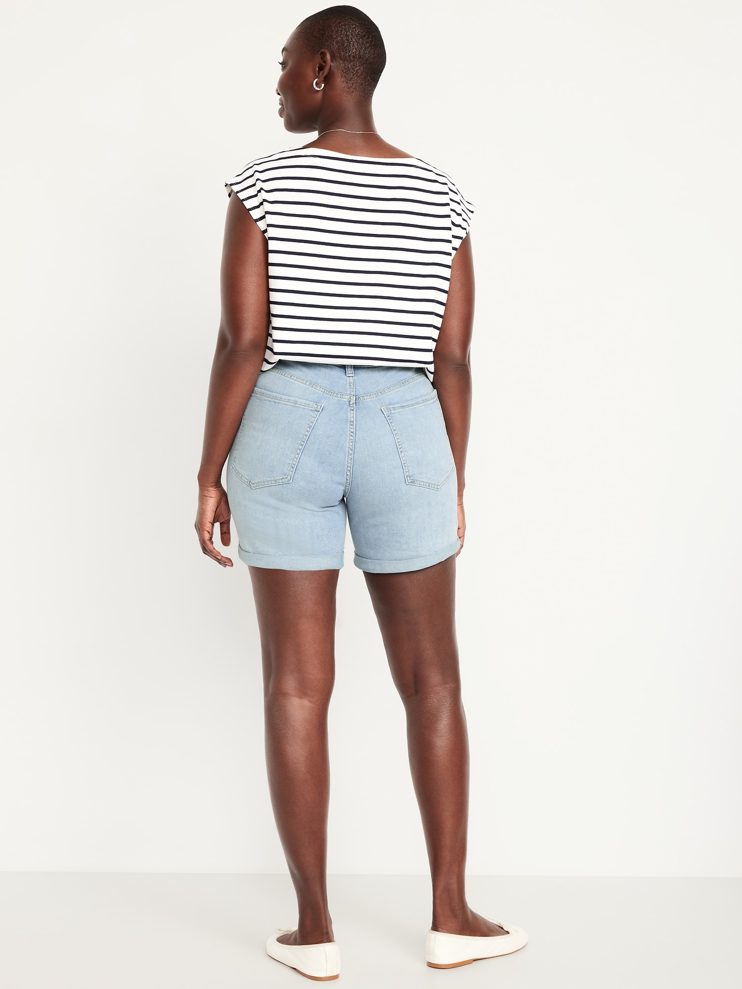 High-Waisted Wow Jean Shorts — 5-inch inseam: button front, zip fly, zip fly, front scoop pockets, back patch pockets, cuffed hem, #849408