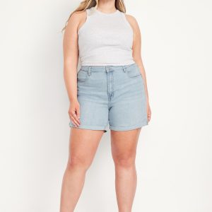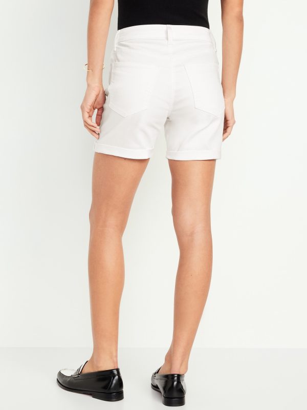 High-Waisted Wow Jean Shorts — 5-inch inseam: button front, zip fly, zip fly, front scoop pockets, back patch pockets, cuffed hem, #849408