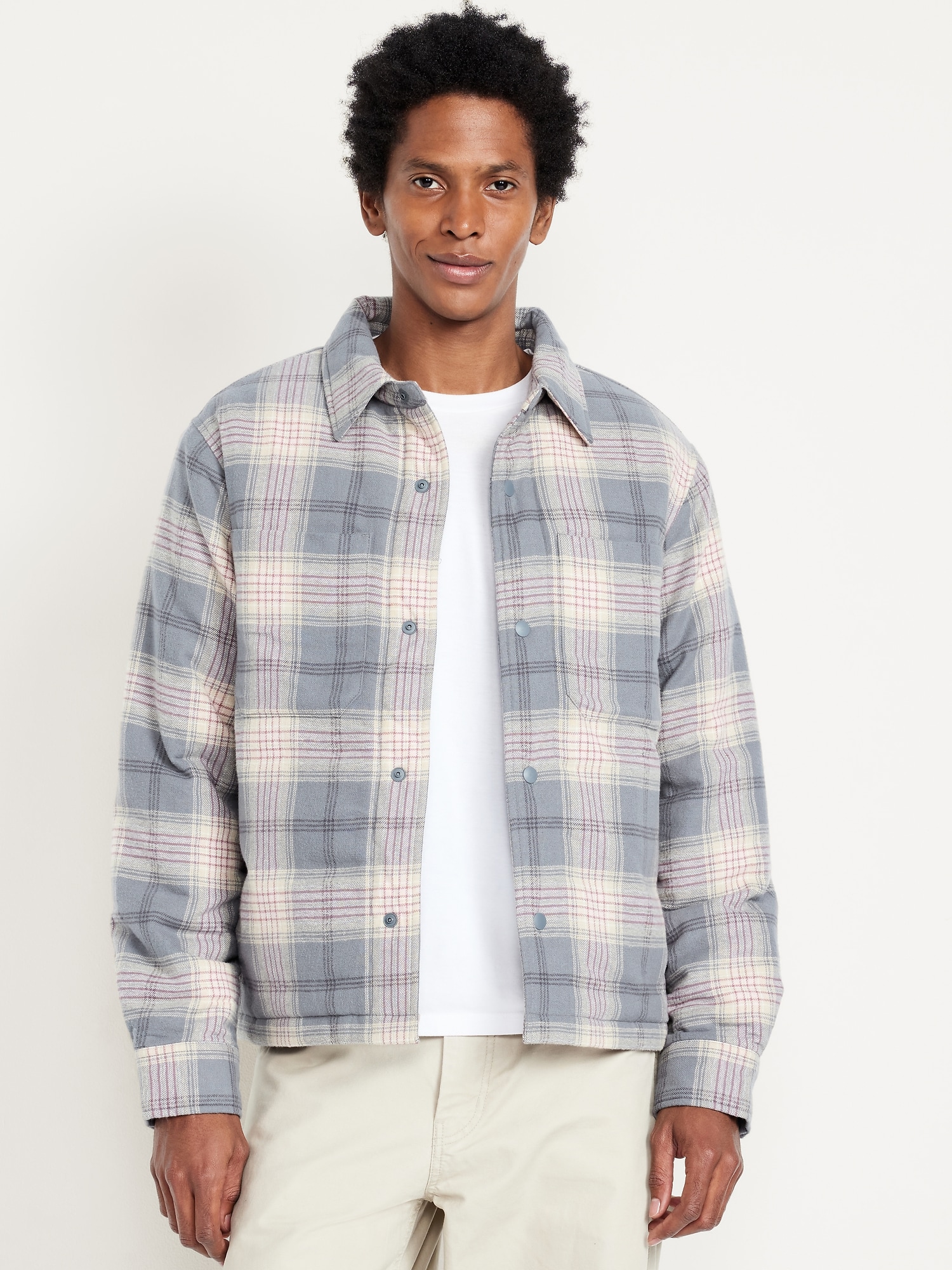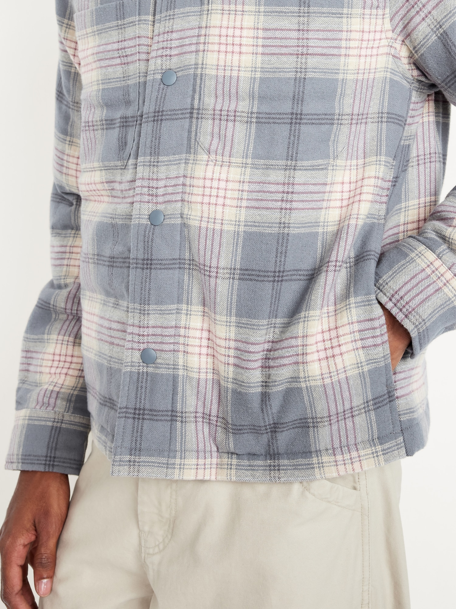 Insulated Cropped Flannel Shacket: spread collar, long sleeves with snap cuffs, full-snap front, patch chest pockets, plaid print, #800296