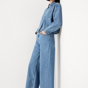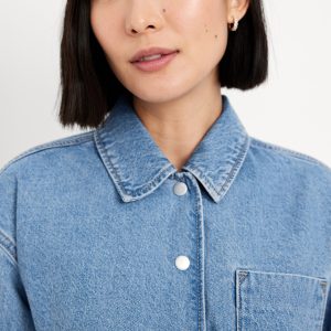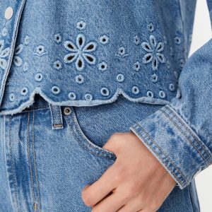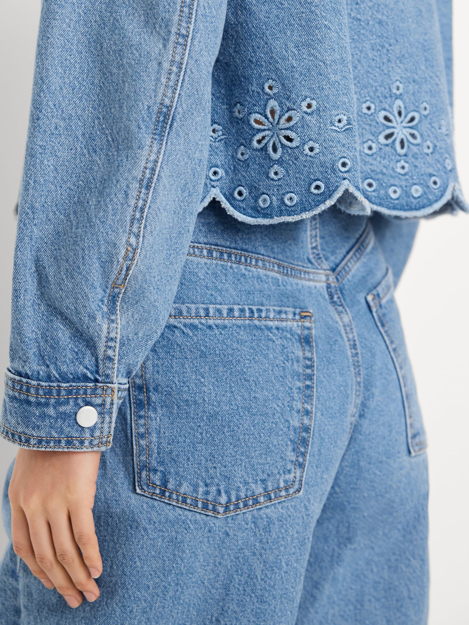 Jean Eyelet Jacket: spread collar, long sleeves with snap cuffs, full-snap front, patch chest pocket, embroidered eyelet trim, scalloped hem, #693759