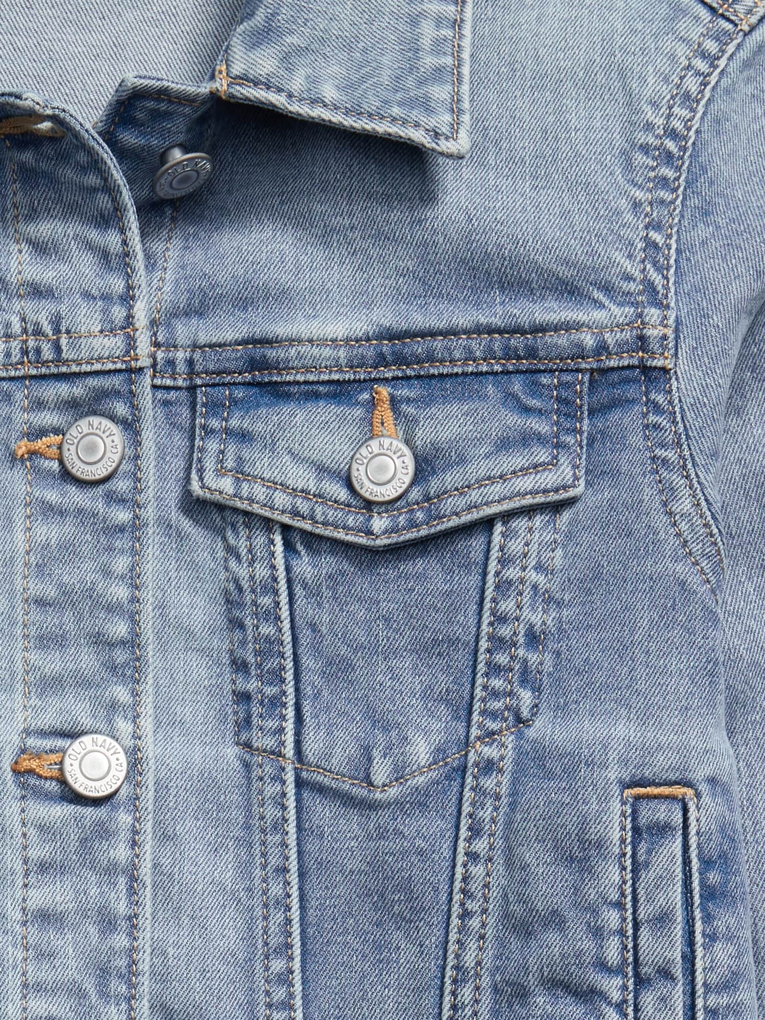 Jean Trucker Jacket for Girls: Notched collar., Long sleeves, with buttoned cuffs., Seamed yoke., Decorative button-flap pockets at chest., Full-length buttoned placket., Vertical welt pockets., Soft cotton denim, with comfortable stretch., We’ve updated the fabric content on select colors & patterns of this style. Select inventory may reflect a slightly different fabric content of 91% cotton, 7% recycled cotton, 2% spandex., #737779