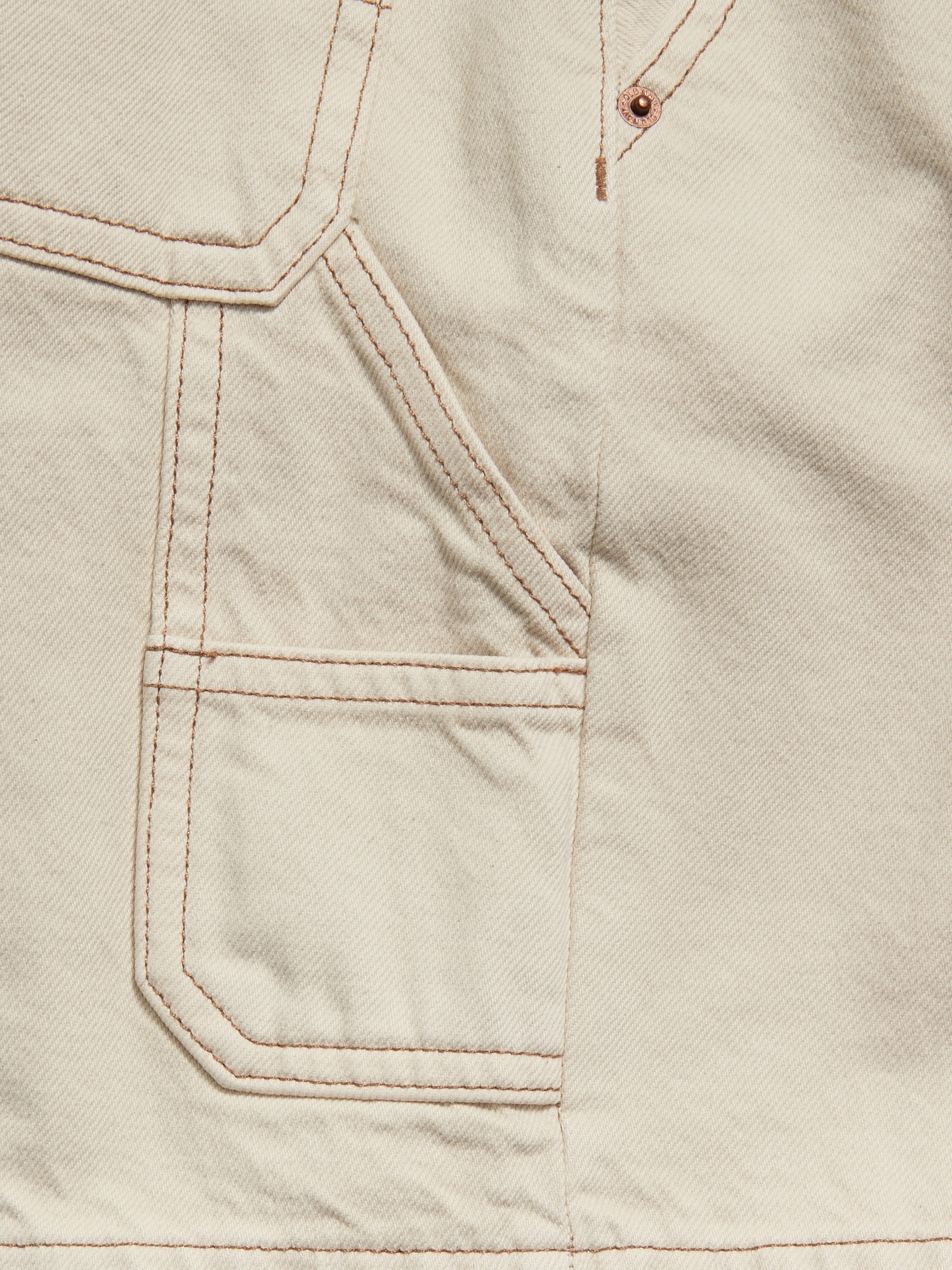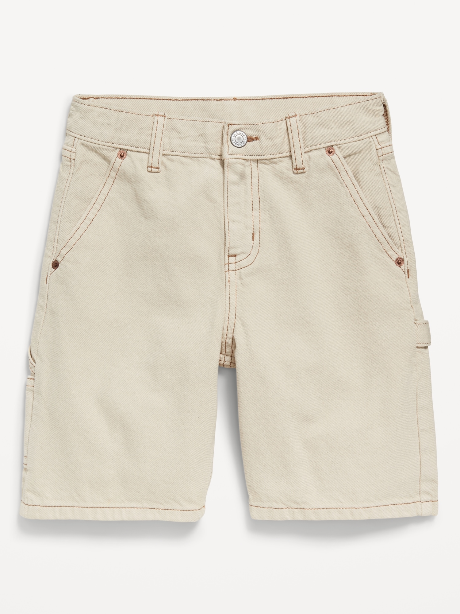 Knee Length Baggy Carpenter Jean Shorts for Boys: interior adjustable waistband, snap-button closure in sizes 5-8, regular button closure in sizes 10-20, zip fly, diagonal pockets at front, utility patch pockets at back and side of leg, built-in hammer loop at left leg, #681352
