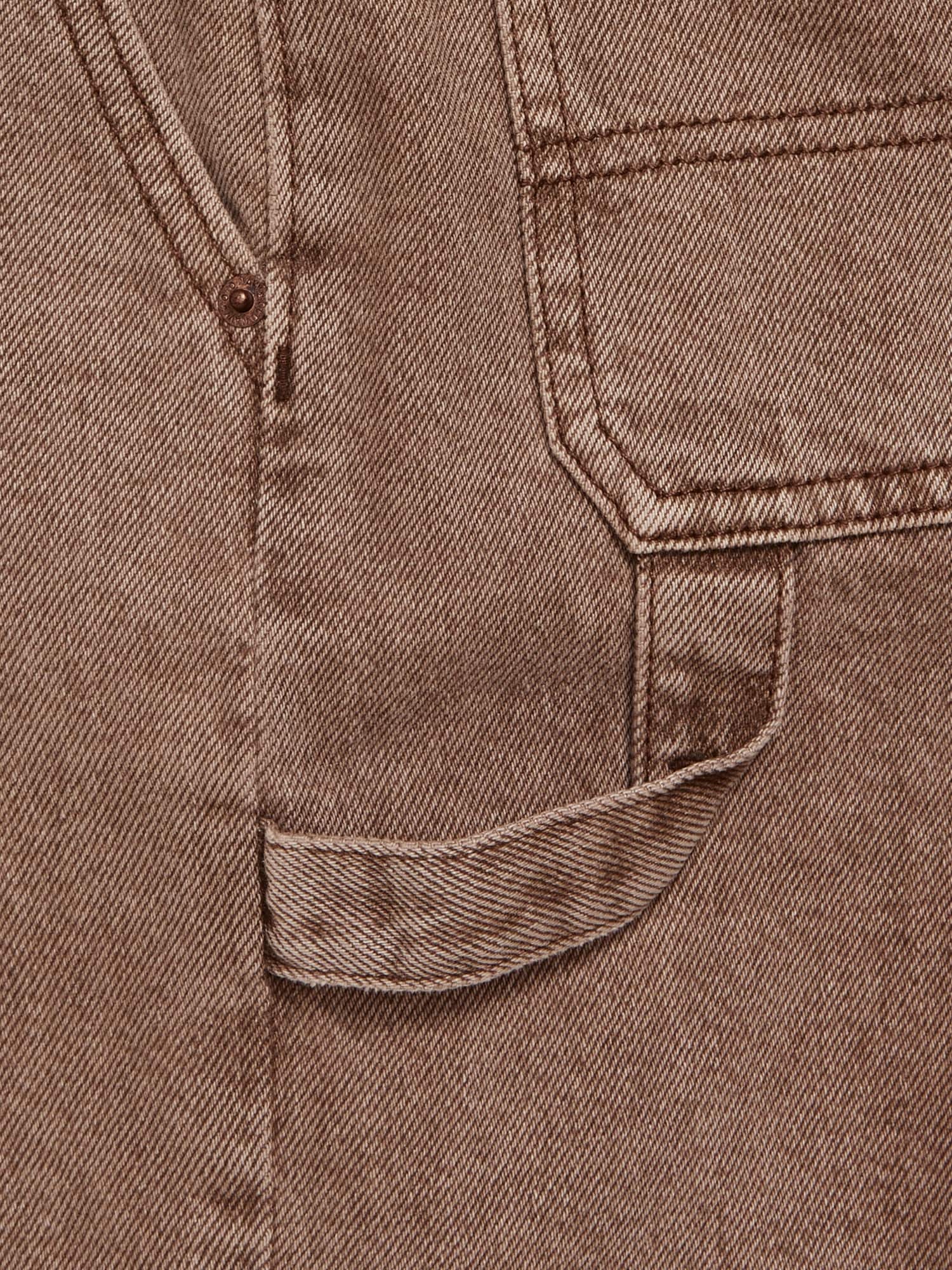 Knee Length Baggy Carpenter Jean Shorts for Boys: interior adjustable waistband, snap-button closure in sizes 5-8, regular button closure in sizes 10-20, zip fly, diagonal pockets at front, utility patch pockets at back and side of leg, built-in hammer loop at left leg, #681352