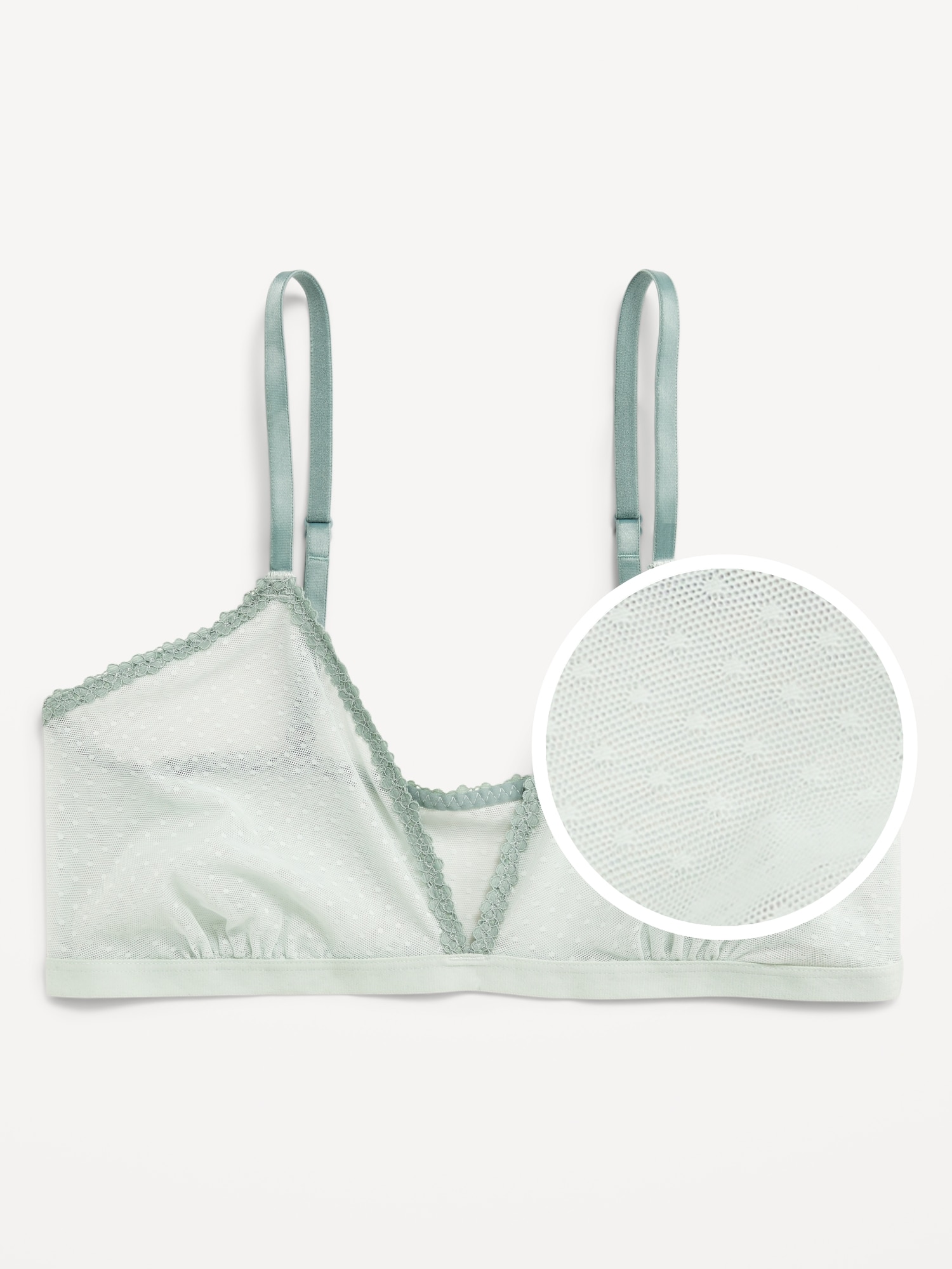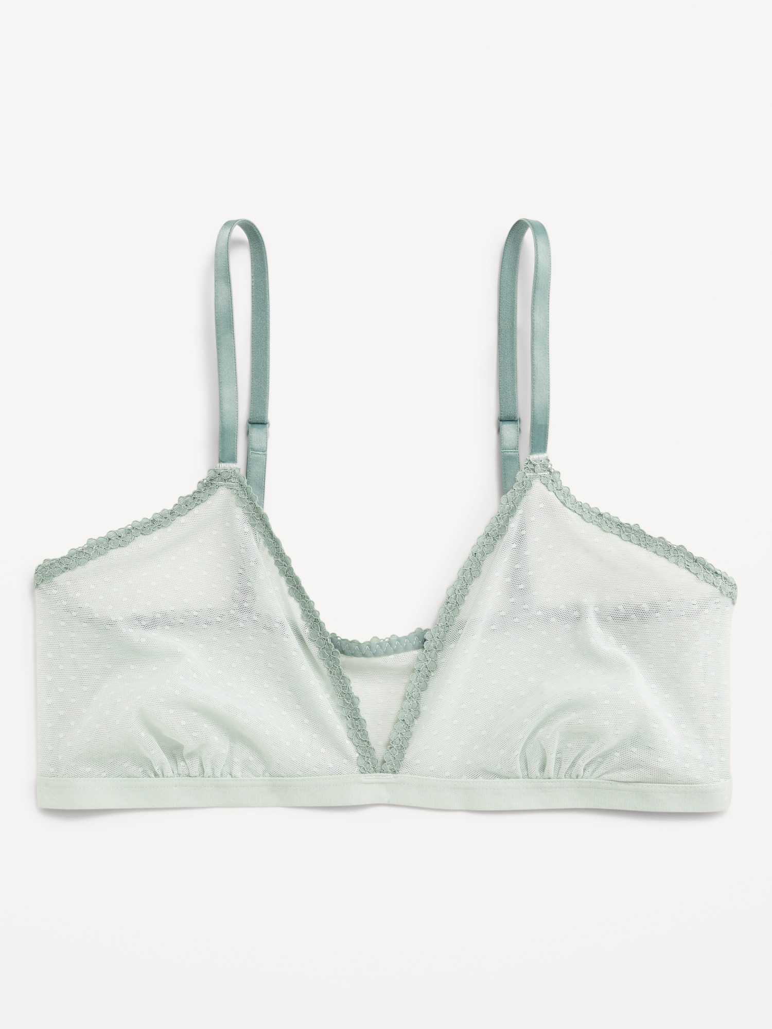 Lace-Trim Dot-Mesh Bralette: plunging v-neck, adjustable straps, brushed elastic hem, #800569