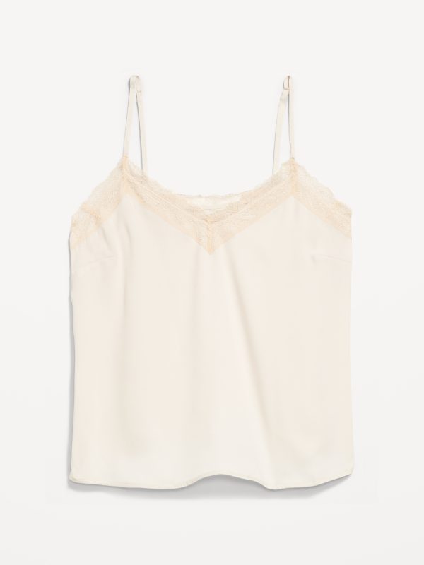 Lace-Trim Satin Cami Top: lace-trim v-neck, adjustable spaghetti straps, darted bust, #798427