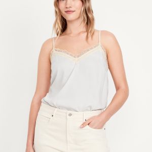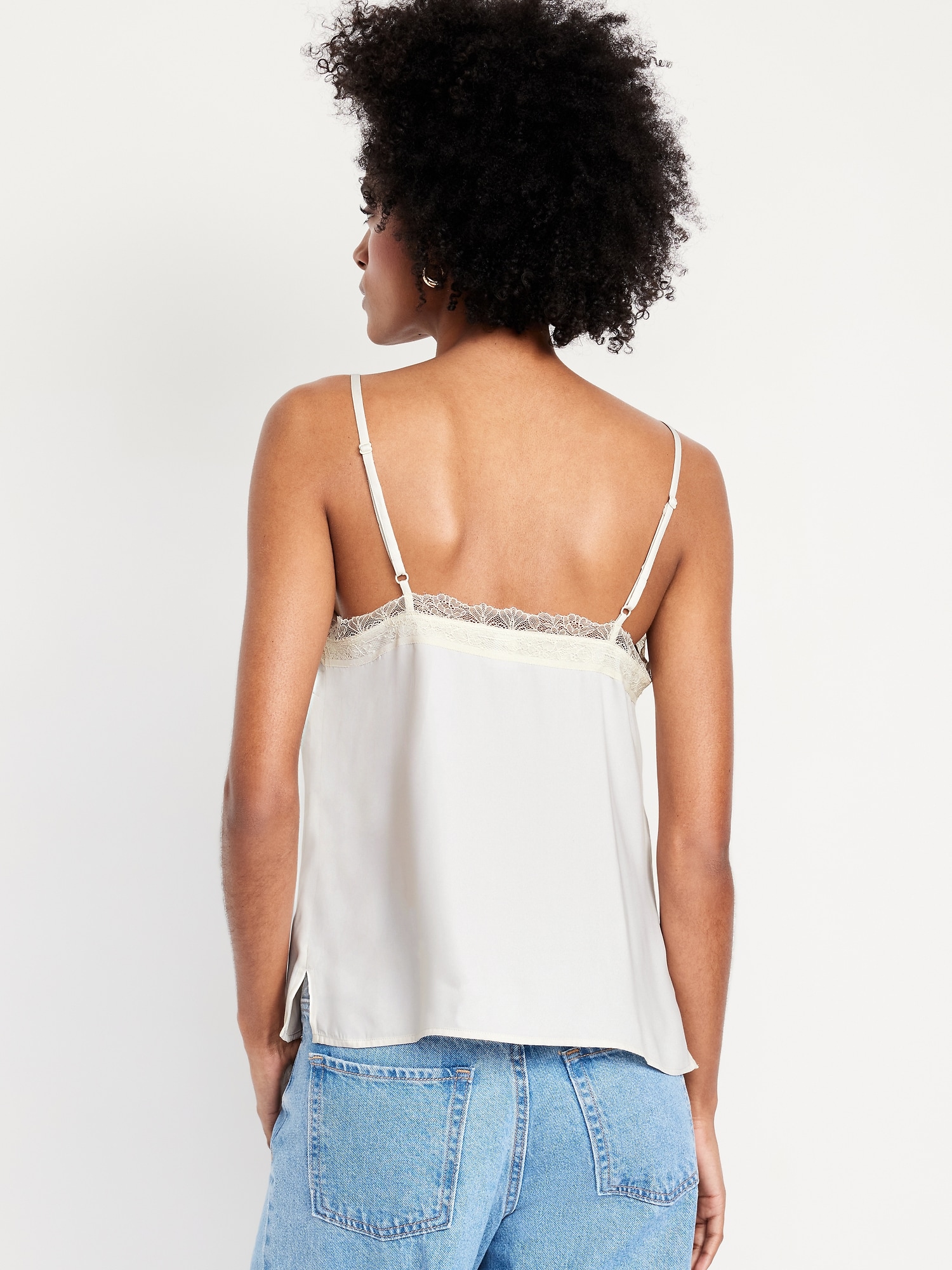 Lace-Trim Satin Cami Top: lace-trim v-neck, adjustable spaghetti straps, darted bust, #798427