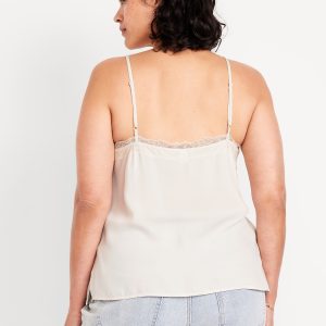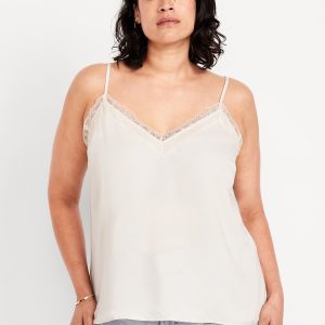 Lace-Trim Satin Cami Top: lace-trim v-neck, adjustable spaghetti straps, darted bust, #798427