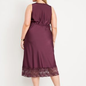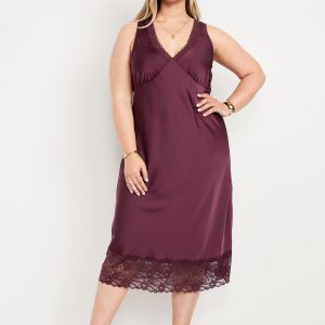 Lace-Trim Satin Midi Dress: lace-trim v-neck, sleeveless, seamed bodice, #798219