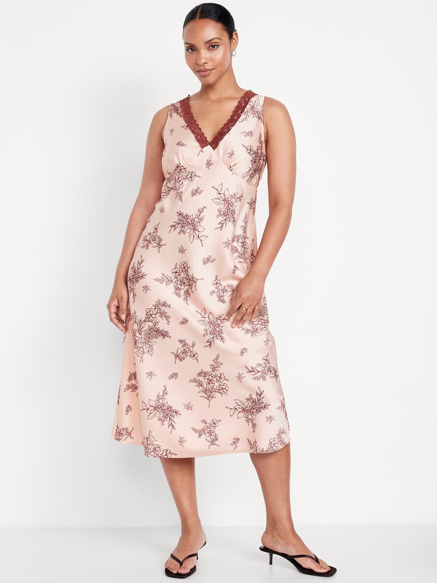 Lace-Trim Satin Midi Dress: lace-trim v-neck, sleeveless, seamed bodice, #798219