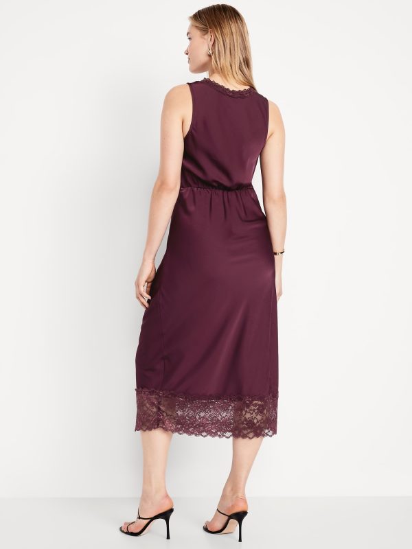 Lace-Trim Satin Midi Dress: lace-trim v-neck, sleeveless, seamed bodice, #798219