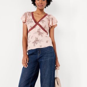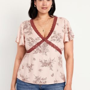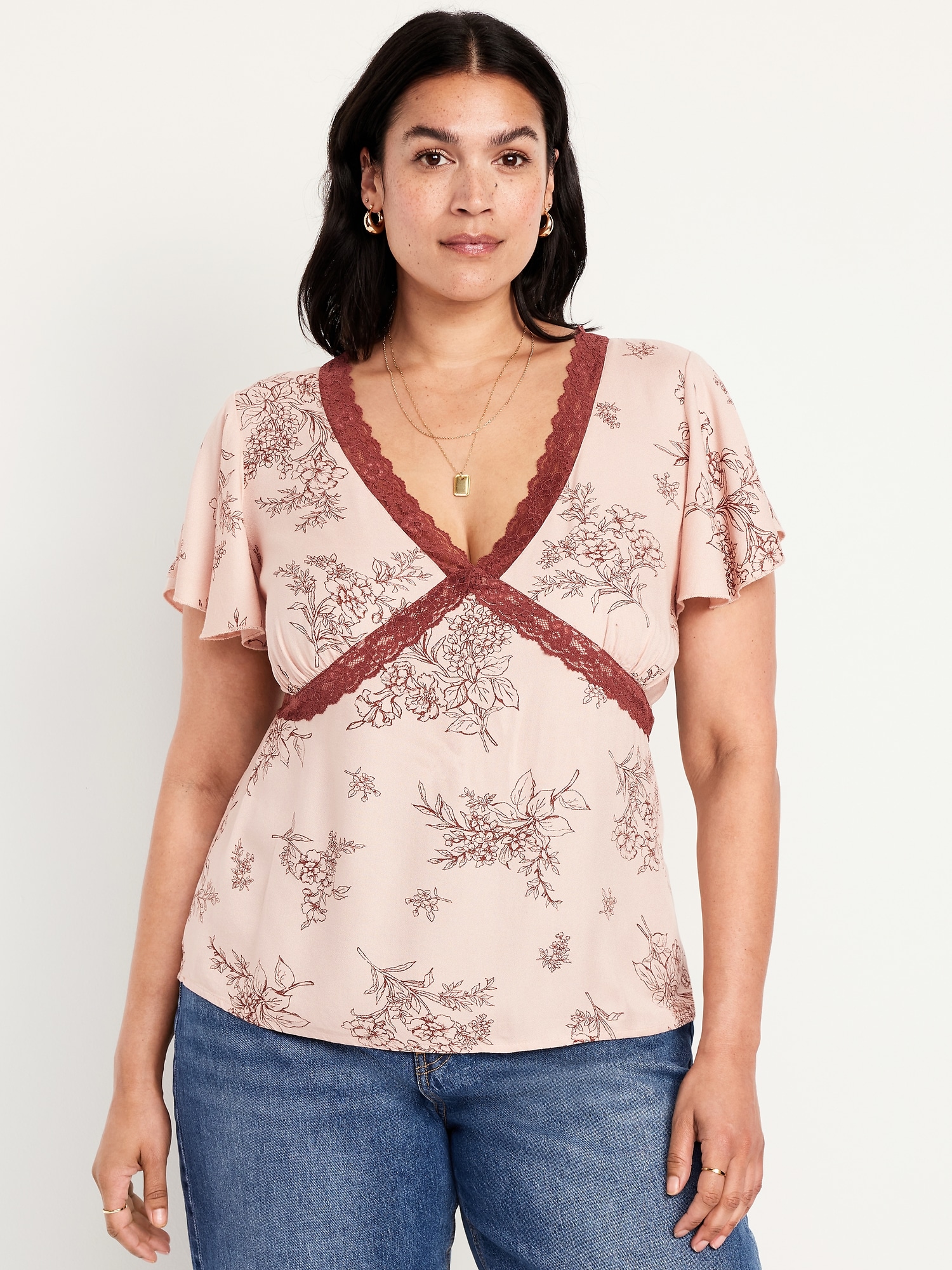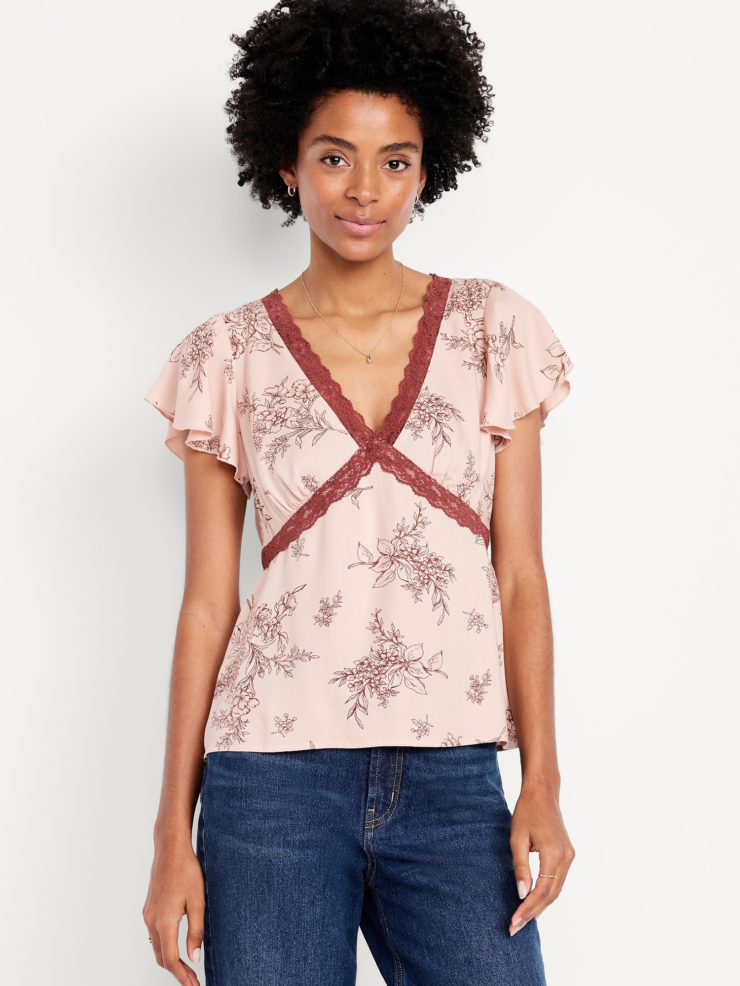 Lace-Trim V-Neck Crepe Top: lace-trim v-neck and bodice, short flutter sleeves, elastic back waist, shirred detail, #798558