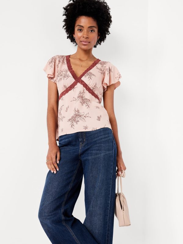 Lace-Trim V-Neck Crepe Top: lace-trim v-neck and bodice, short flutter sleeves, elastic back waist, shirred detail, #798558