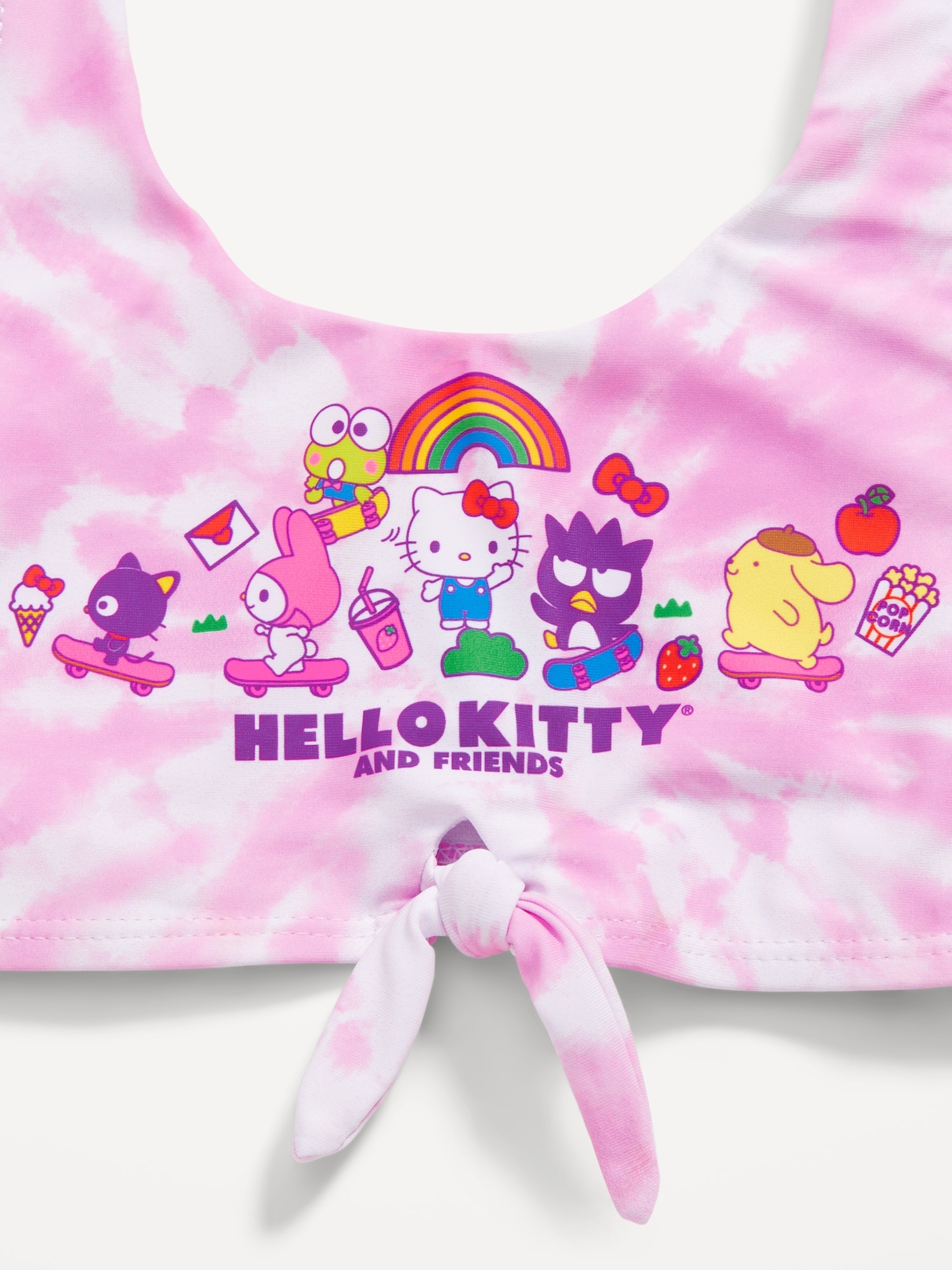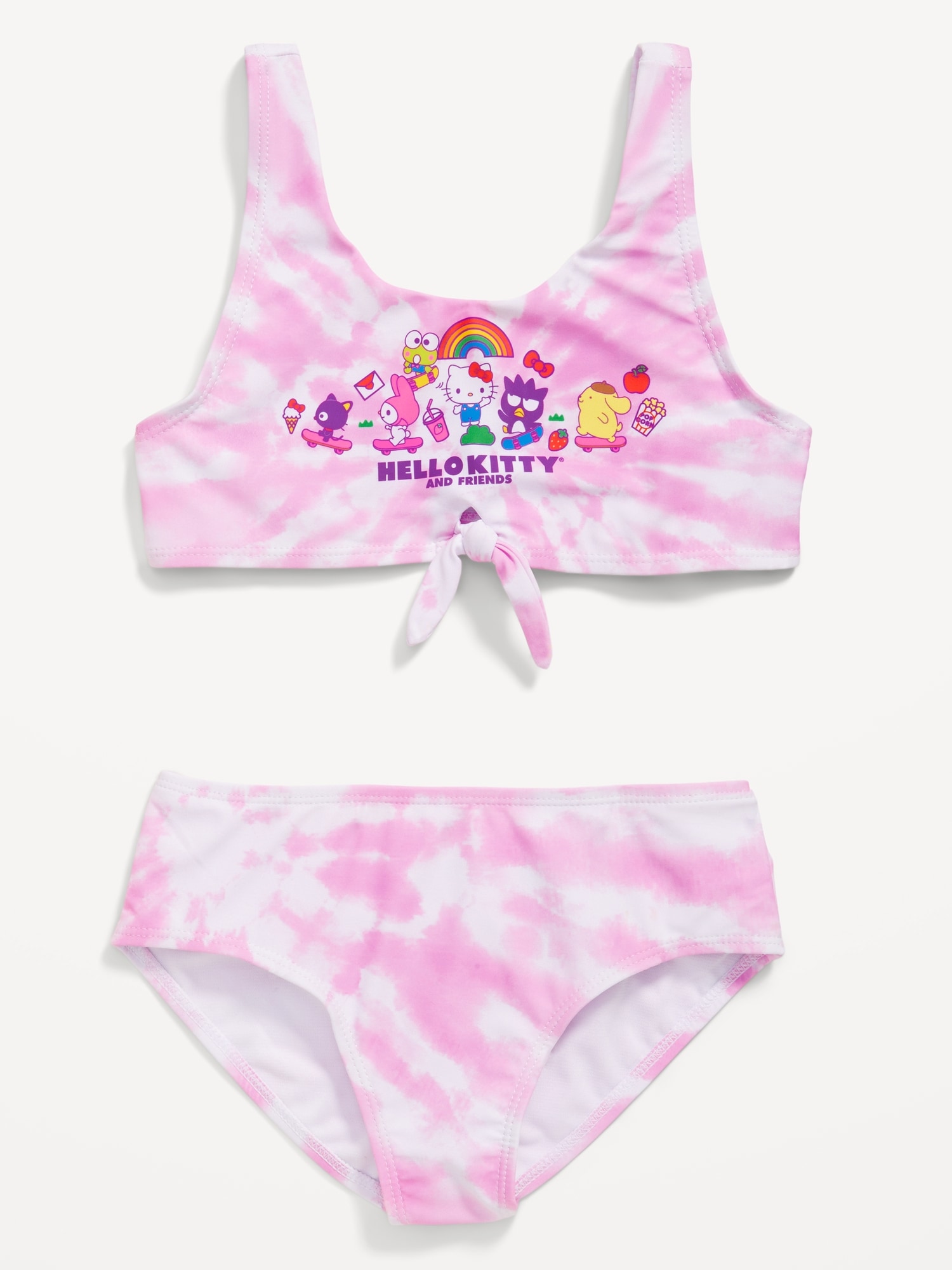 Licensed Graphic Tie-Front Bikini Swim Set for Girls: scoop neck, wide shoulder straps, tie-knot at front, matching swim bottoms, elasticized waist, licensed graphic, © Disney., © 2025 SANRIO CO., LTD. Used Under License., #692029