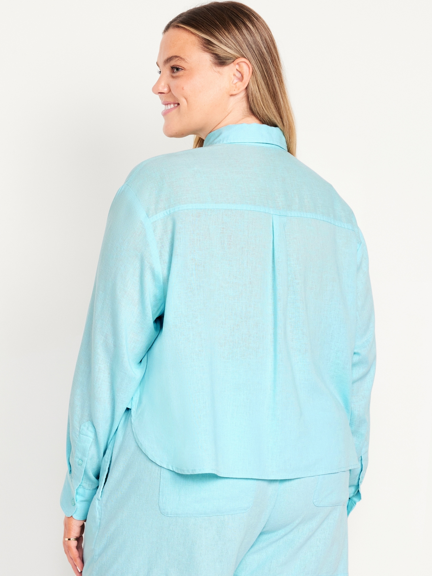 Linen-Blend Button-Down Crop Shirt: spread collar, long sleeves, buttoned cuffs, full-button front, patch chest pocket, #760758