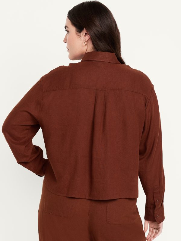 Linen-Blend Button-Down Crop Shirt: spread collar, long sleeves, buttoned cuffs, full-button front, patch chest pocket, #760758