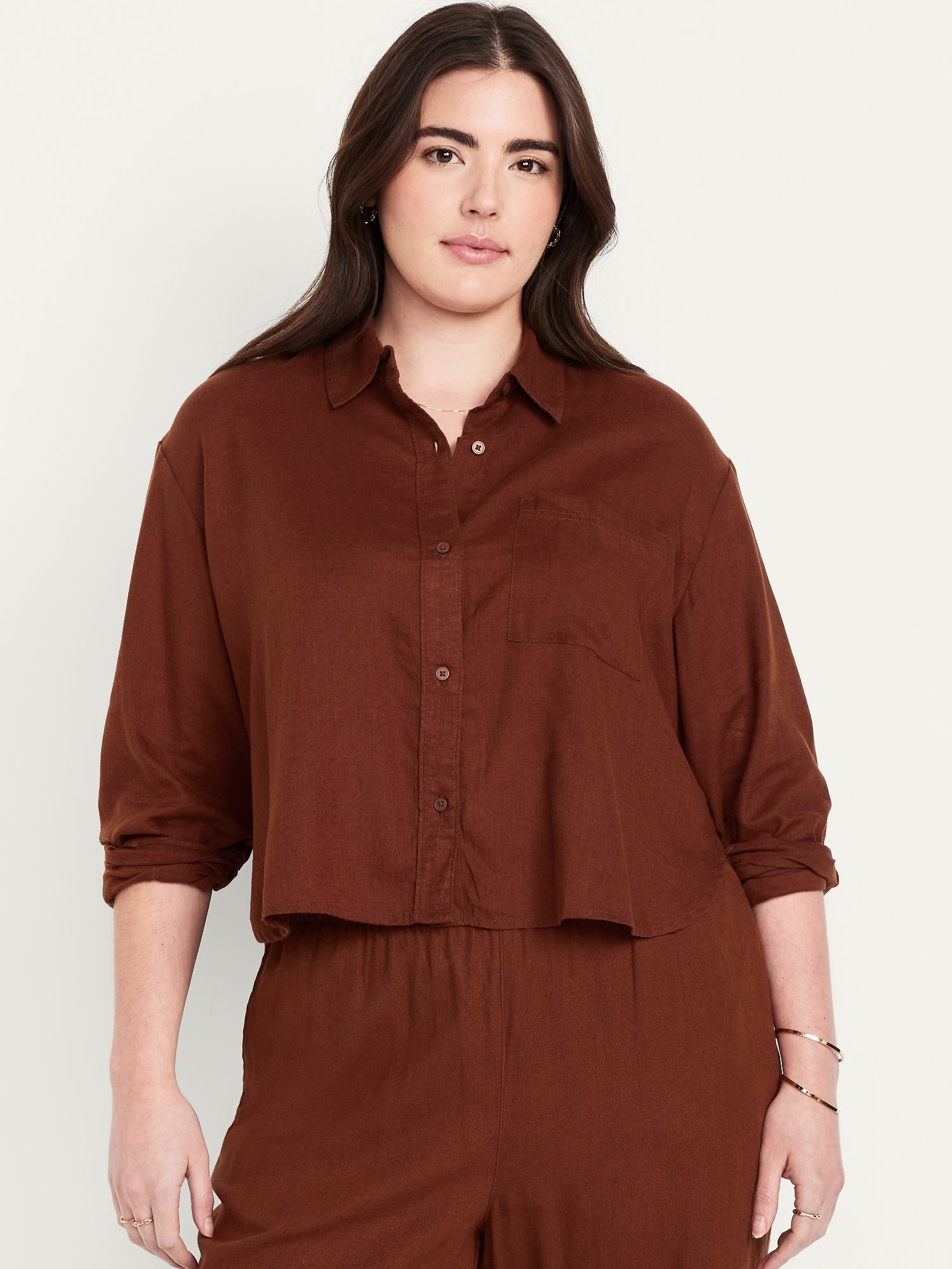 Linen-Blend Button-Down Crop Shirt: spread collar, long sleeves, buttoned cuffs, full-button front, patch chest pocket, #760758