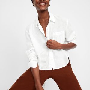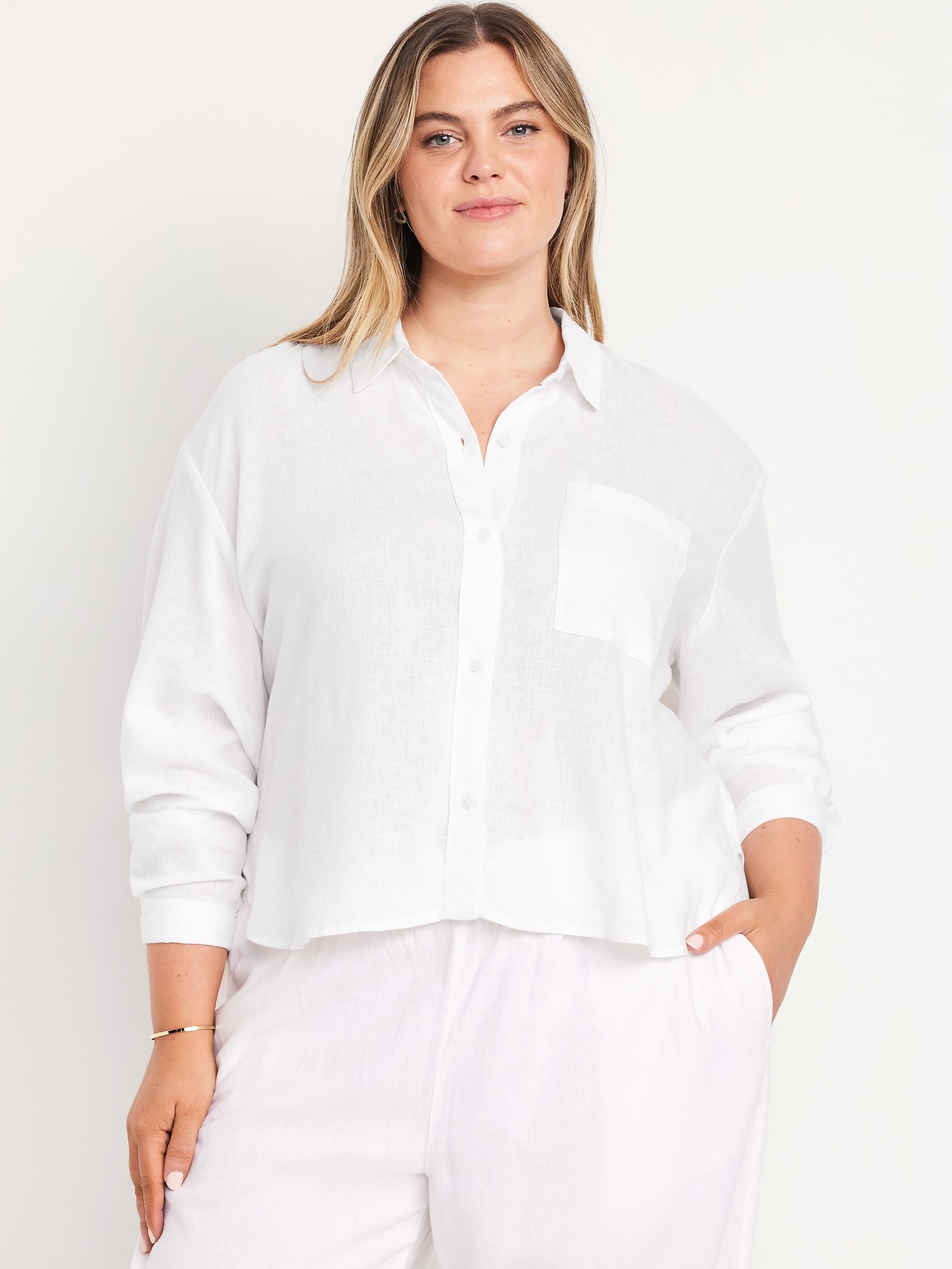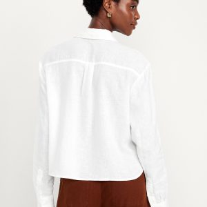 Linen-Blend Button-Down Crop Shirt: spread collar, long sleeves, buttoned cuffs, full-button front, patch chest pocket, #760758