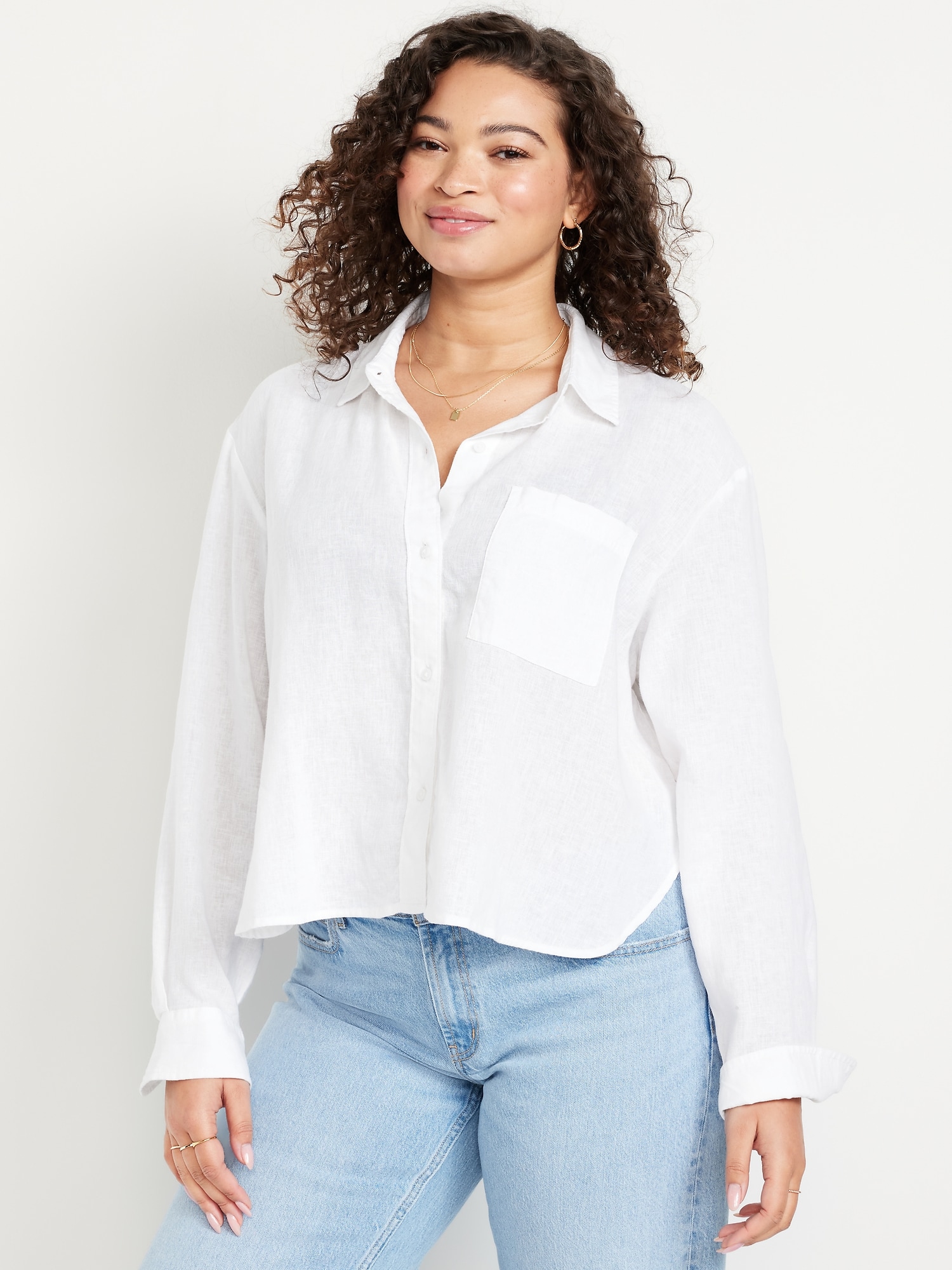 Linen-Blend Button-Down Crop Shirt: spread collar, long sleeves, buttoned cuffs, full-button front, patch chest pocket, #760758
